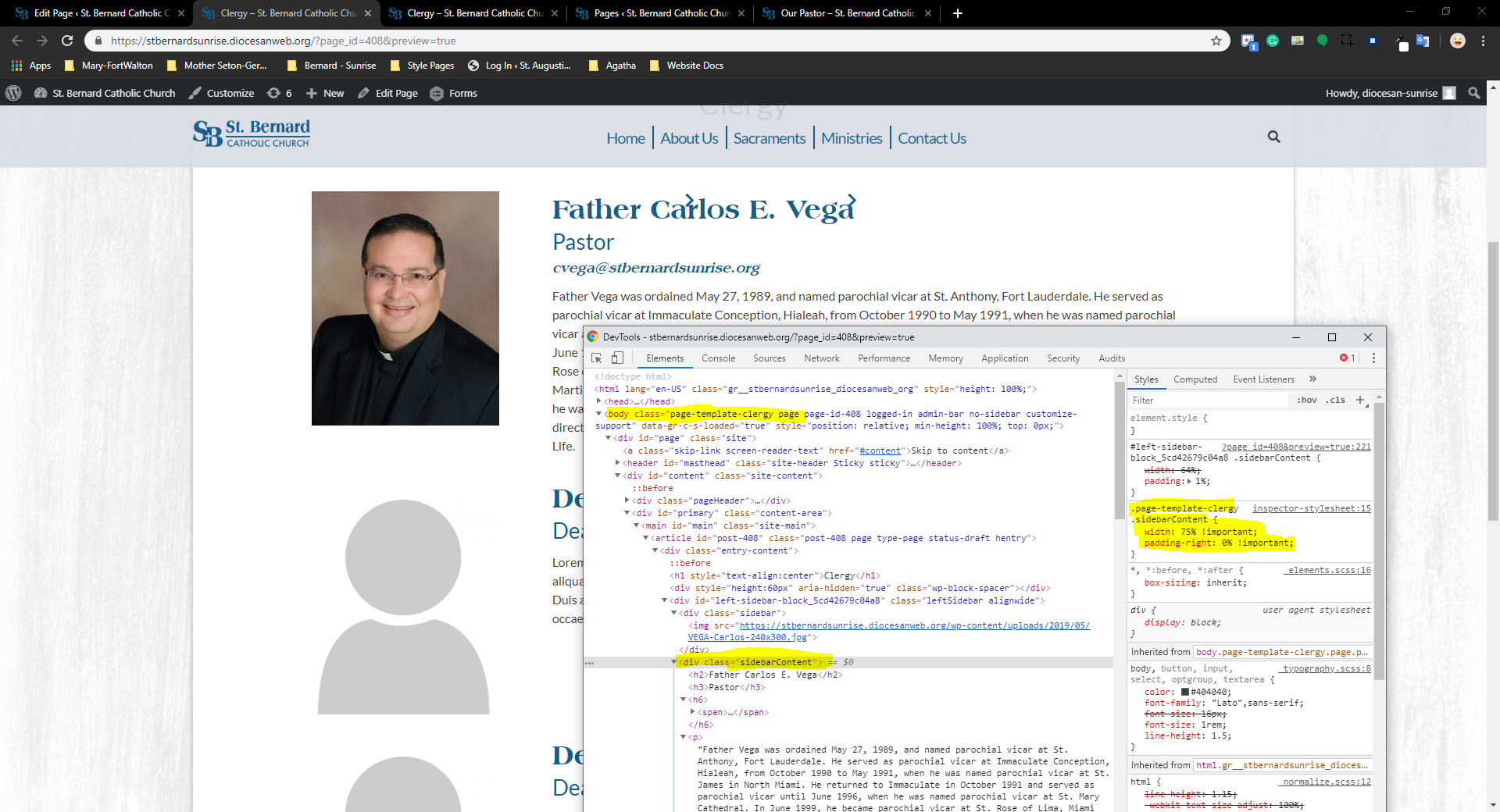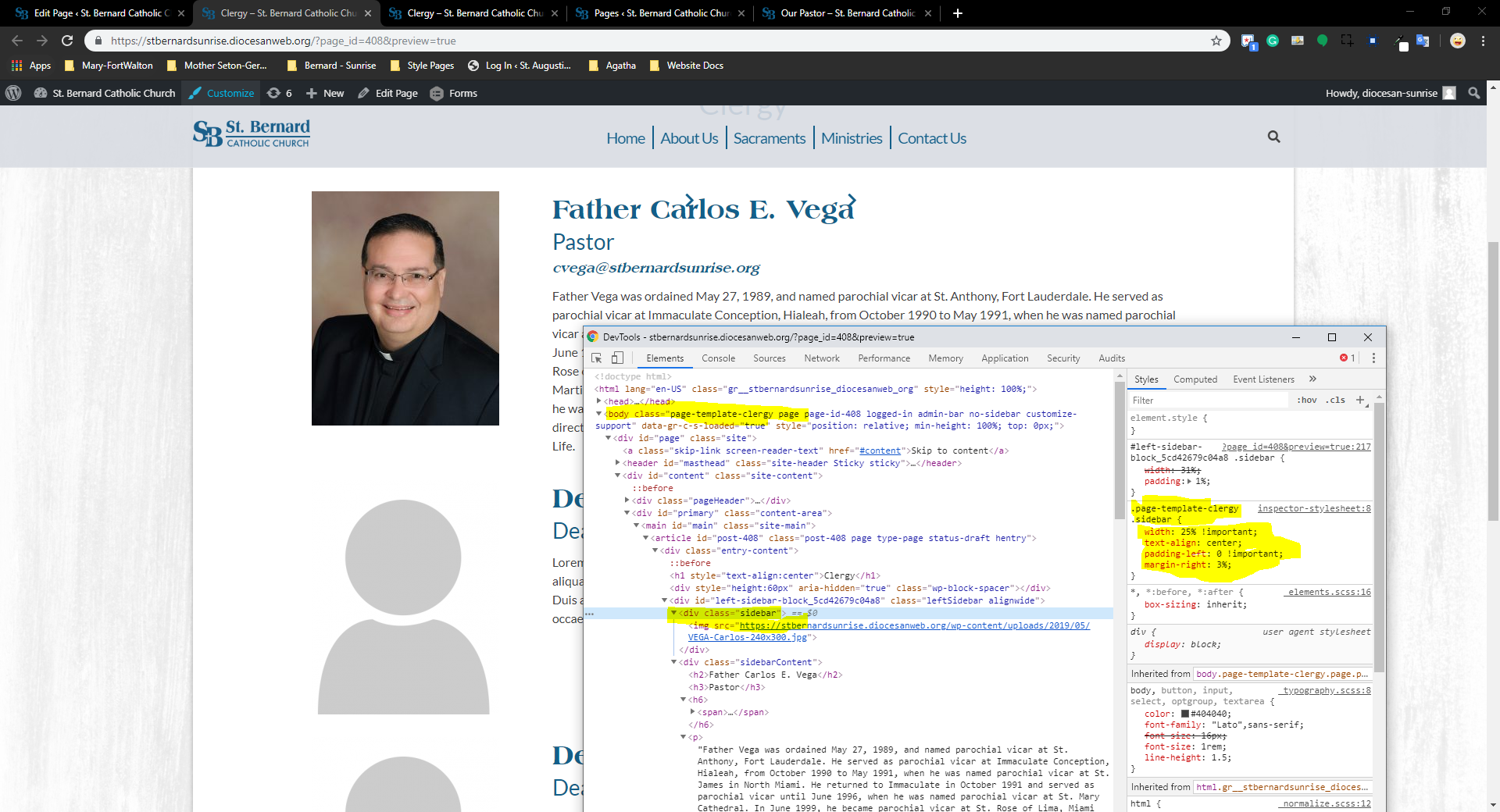For the clergy staff page, they will be doing a left sidebar block, but instead of it being one third/ two third column, it needs to be like a 1/4, 3/4 like photo below. I believe the easiest way to do it is to do a template for staff or clergy (the other staff page uses columns, so that is not an issue, so I named it clergy in the photos below, highlighted. I made a few tweaks - also highlighted - that are of note. Sullivan made a thing just like it for me recently using ACF and designing it out, not sure what your preference is, but CSS I snipped will still help you. There is a style tag after each sidebar block loaded, so it could be added in there. I think.