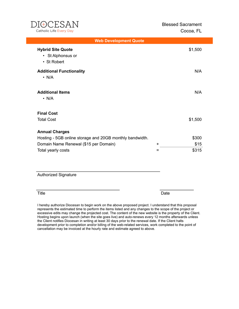 As I mentioned in our meeting, I have some attachments and the 2 website links for you. Let me know which website design you would like Blessed Sacrament to utilize - on both the "questionnaire" and proposal. The Logo and Branding proposal also would need a choice indicated - there are 2 logo options, and then the full branding package includes both logo options.