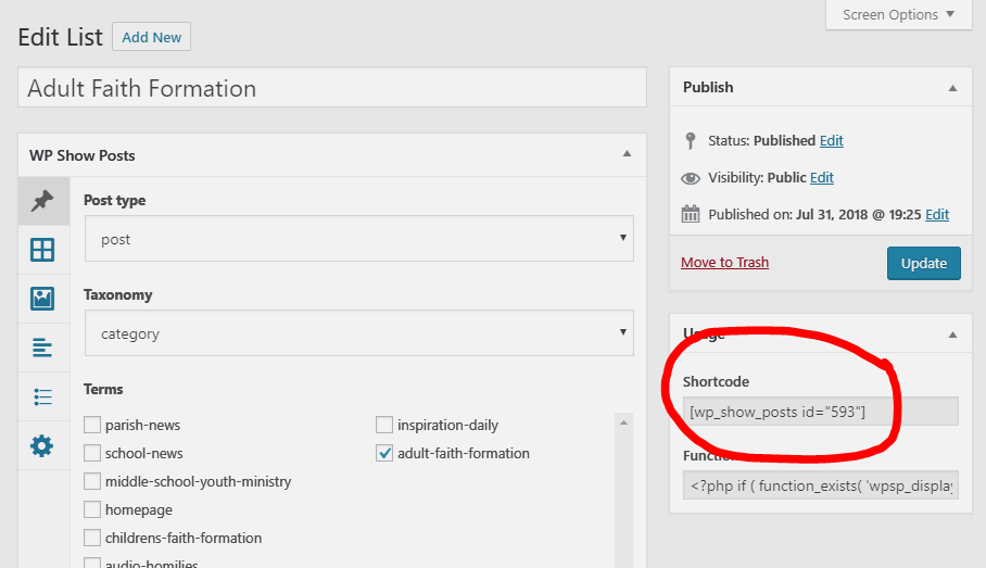 I am slowly working on the pages. I have found the post option to be a great tool, especially for pages like Adult Faith Formation that have a ton of programs. However, is there a way to have all the posts tagged adult faith formation show up? Right now, I think it only shows the most recent six. I thought maybe I could add a recent posts widget, but it wouldn’t allow me to do that, so maybe we can up the amount of posts it shows on a page?