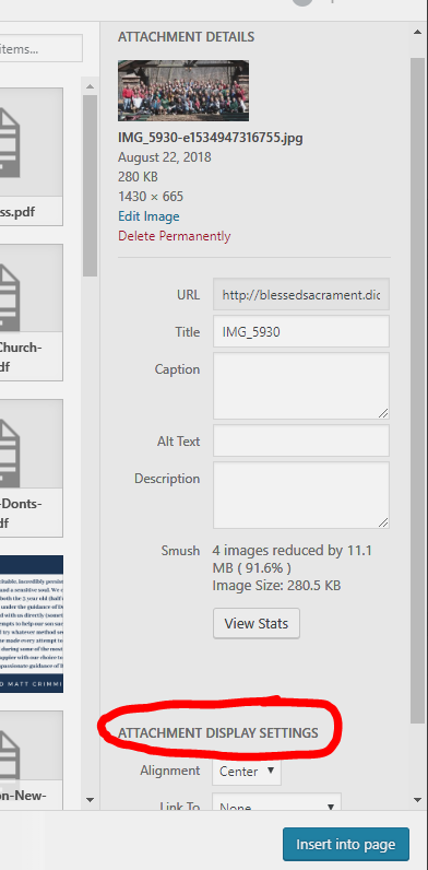 No problem! I actually had a meeting at our diocese yesterday in the afternoon, so this worked out perfect. I totally didn’t see the attachment display option when uploading the images-thank you!