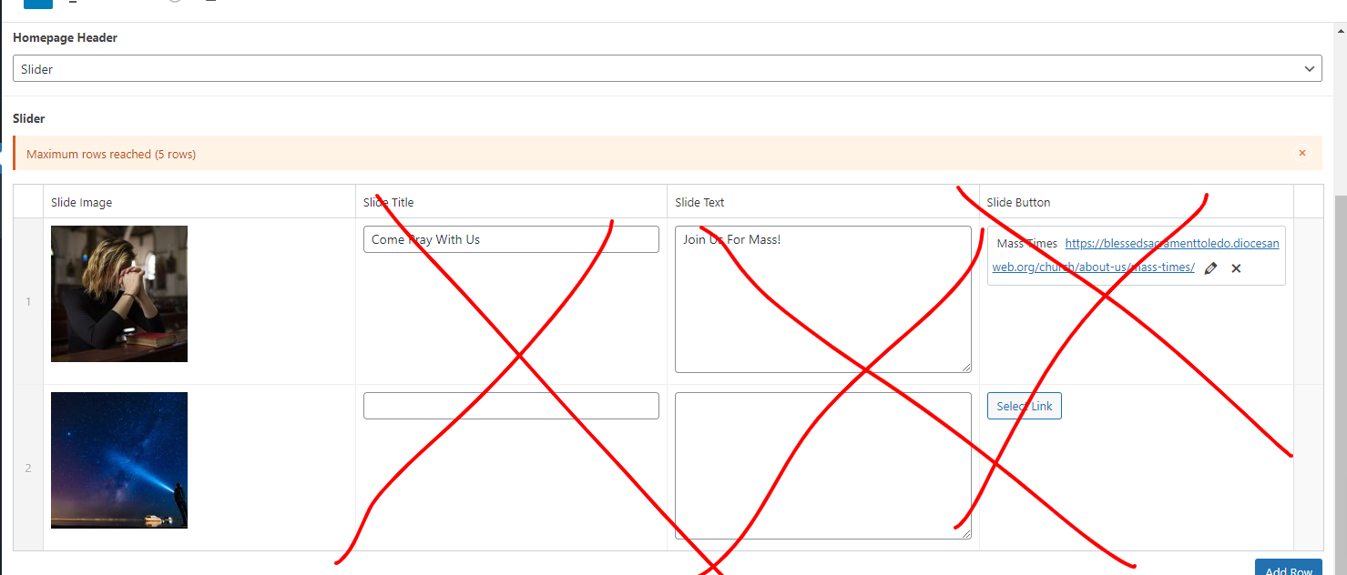 Church - Homepage - Backend - Homepage Header Tab - Slider, Remove Slide Title, Slide Text and Slide Button. They don't do anythingo Description:(detailed overview of what needs to be completed.