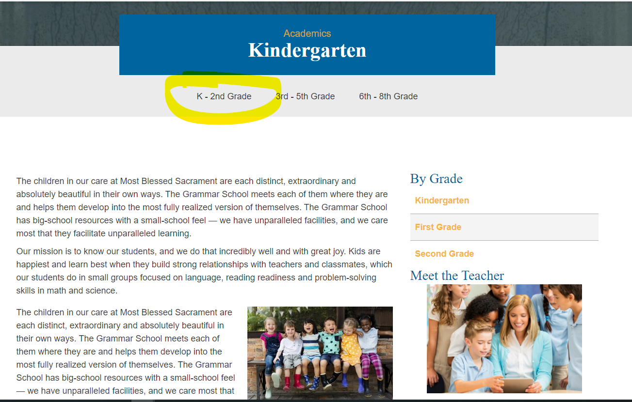 From the list: School ✔ Pages - Tabs, current parent should be highlighted Cody A. added this on Jan 28, 2021 Completed Jan 29, 2021 by Kyle B. Assigned to Kyle B. Notes https://blessedsacramenttoledo.diocesanweb.org/school/academics/k-2nd-grade/kindergarten/ image.png 626 KB • Download Comments & Events Kyle Brown completed this to-do. Jan 29, 2021 at 4:02 PM