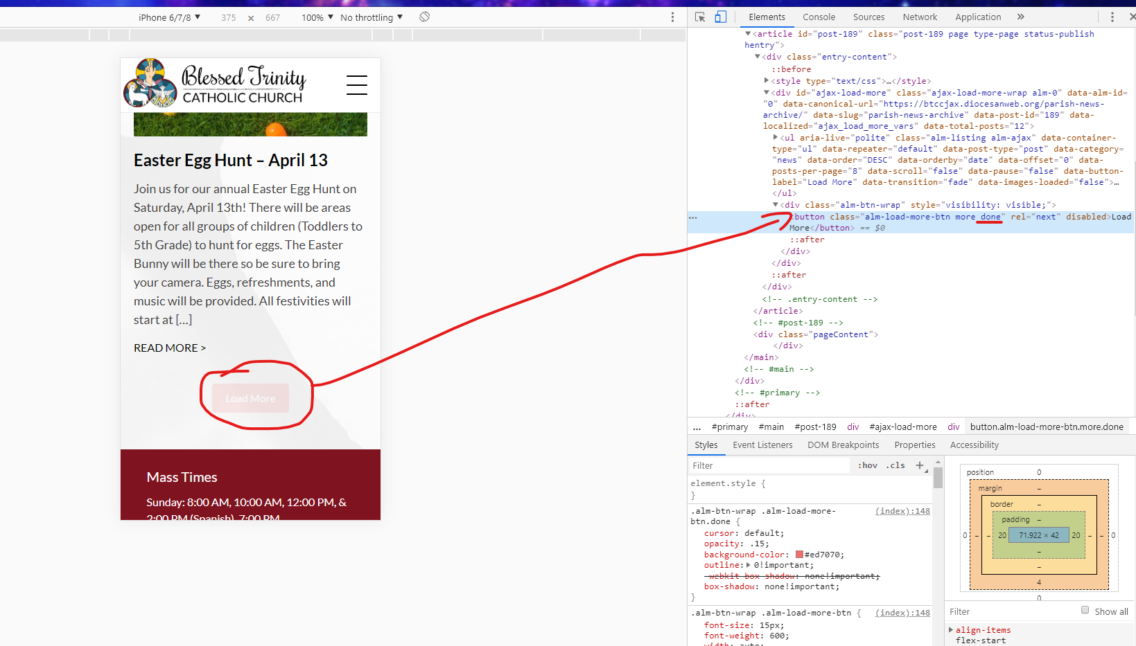 When there are no more posts to load, the button should just disappear. It adds a class to the element called done. You could just hijack that and do display:none. Thanks.