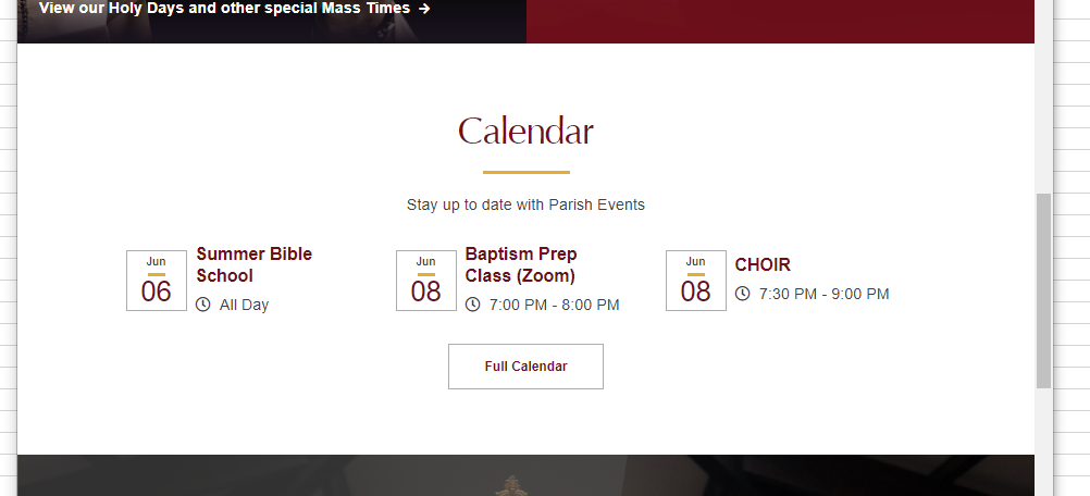 Also, is the section "Mass Times" able to be changed to put "upcoming calendar events"? I like the way it is on our parish site (see below).