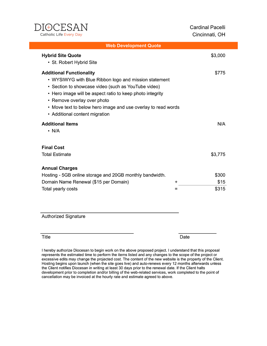 Thank you very much for sending back the signed proposal. We are very excited to work with you in bringing a new website to Cardinal Pacelli.