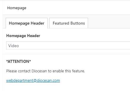 ✔ Homepage Backend - header section, add option for video, but no other fields, just a note that says to contact Diocesan like we've done on other sites