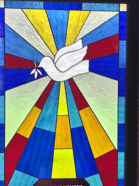 We also like the idea of a dove with an olive branch, which I think is a universal Christian symbol of God’s promise of love, hope and peace – and combined with a cross, like the idea in “Doves with Cross” image, that could be lovely. Also – the “Dove with Olive Leaf” image is actually a photo of a stained glass in the Holy Cross chapel. The stained-glass image we found together in our last meeting was very visually appealing.