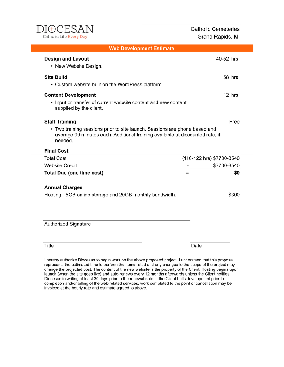 I have attached a copy of the proposal for your new website. The proposal is a full breakdown of the project. You are able to see each phase of the project, the time we determined it would take to complete each of the phases, as well as what the final cost would be. As Brian mentioned, the cost for the website creation will be covered. I have included a line indicating a full credit of the website project.