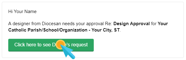 When you receive an email for approval, you should see a green button in the email that reads, "Click here to see Danae's request." Please click on the button to approve or not approve the design.