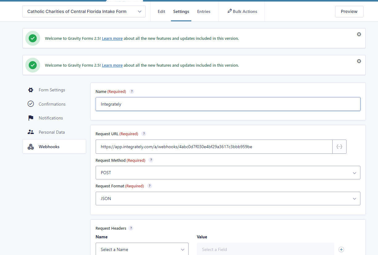 I have added the Webhook add-on for Gravity Forms and have added that Integrately API key to the Project Rachel form. Is that the correct form for it? I tried to find a way for you to use the add-on on your account, but for whatever reason, it would not let me. So, until that is added or fixed, it would have to be done through us and we would just need the Webhook URL.