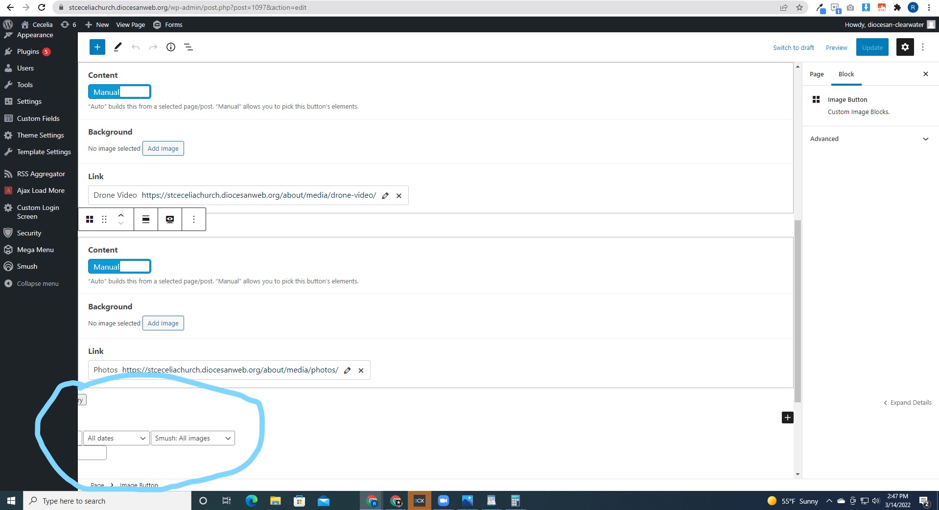 See screenshot. Circled area appears when you click the image button to manually assign a featured image for the button. Tried logging out of site and back in and tried CTRL Click to open new tab and it doesn't work as intended. Thanks!