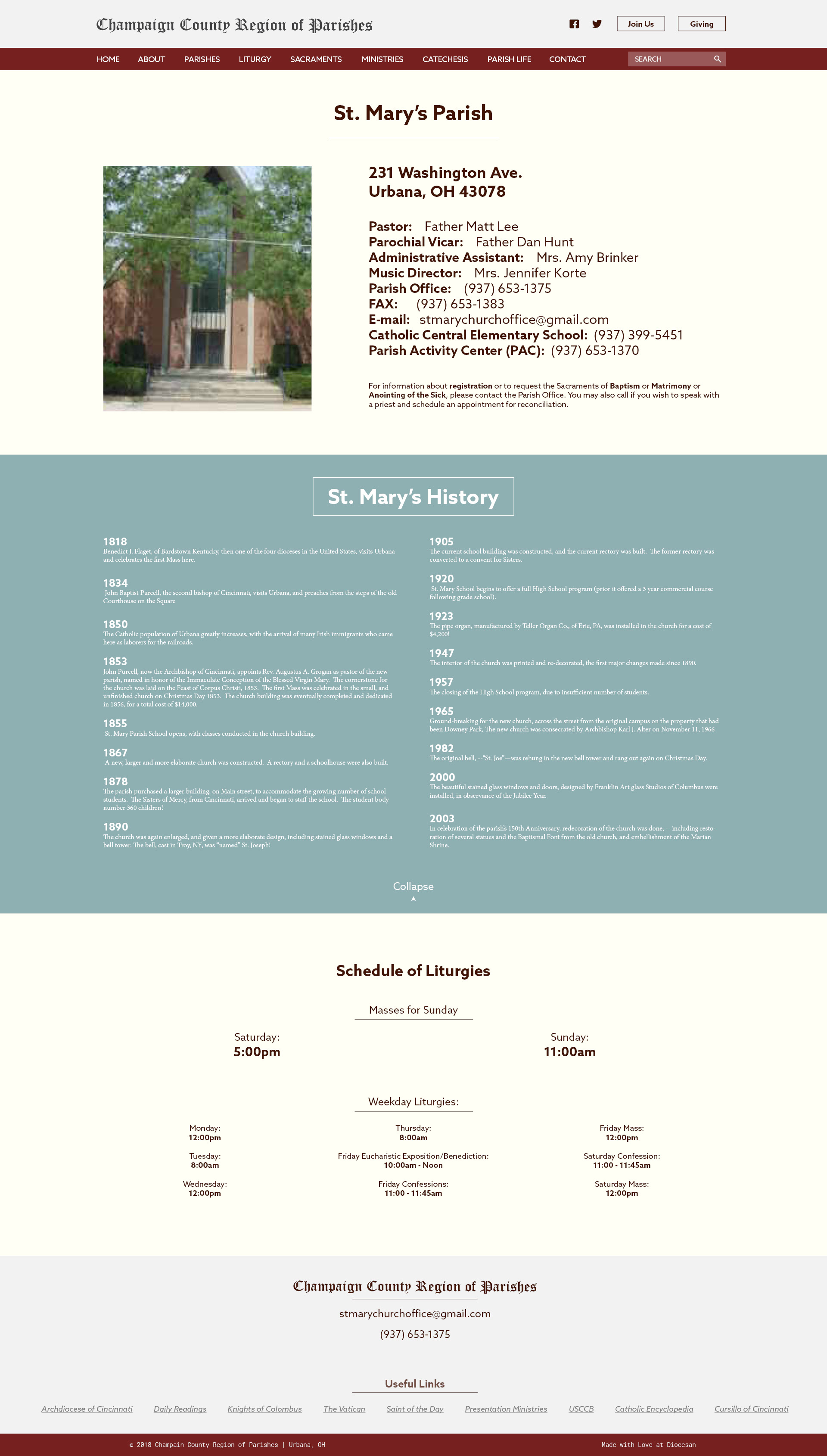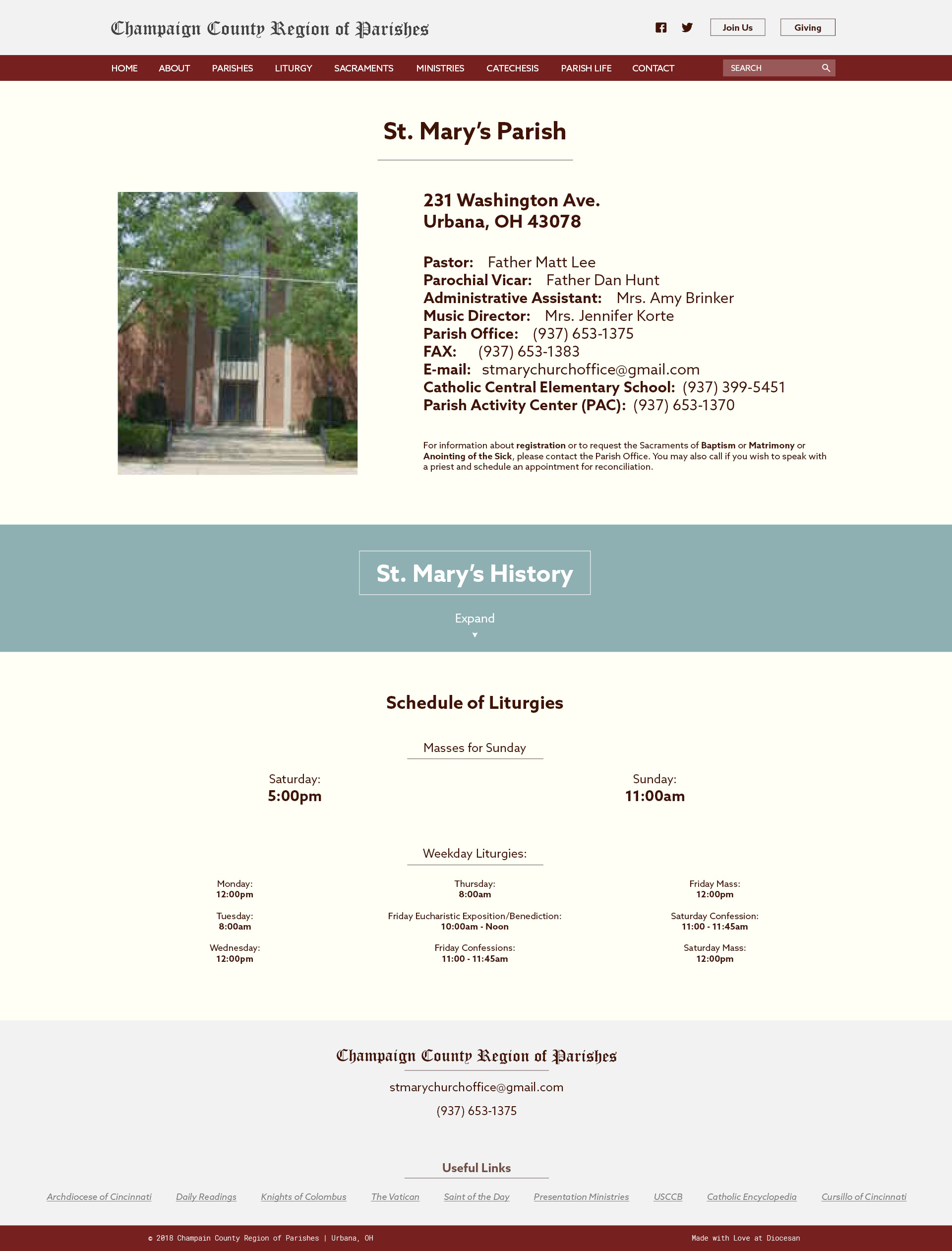 The second and third page are to represent each parish page on the site, Giving them a section with what we call an accordion to hold the history or whatever info you want to share about each parish! The two pages show how the functionality would work with the Collapse and Expand buttons.