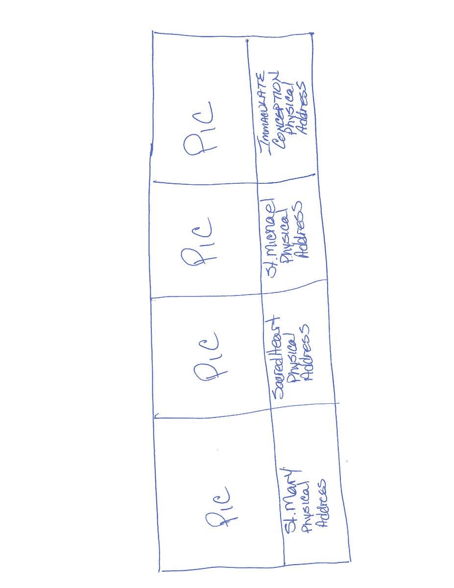* The seventh row has the pictures of the churches which will be the links to the individual parish pages. I know you'll be changing those pictures to the ones I'm sending you of the interiors, and I still owe you pictures for St. Michael and Immaculate Conception. I should be able to send you those next week. I'm not a fan of the way the parish name and address are over the pictures. I wondered if you could make each one a vertical rectangle that had the church picture at the top of the rectangle and the church name and physical address below. The color for the part below the picture where the name and address are would be whatever color we assign to that parish. I've attached a crude drawing of what I mean.