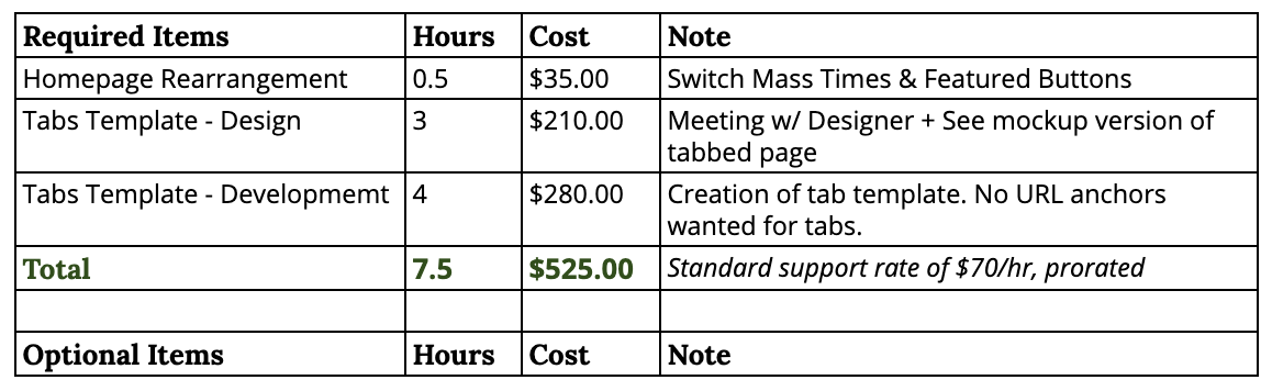 Since you are well below your originally quoted hours for both design and development, these updates will be at no additional charge to the parish and will be covered by the initial quoted cost.