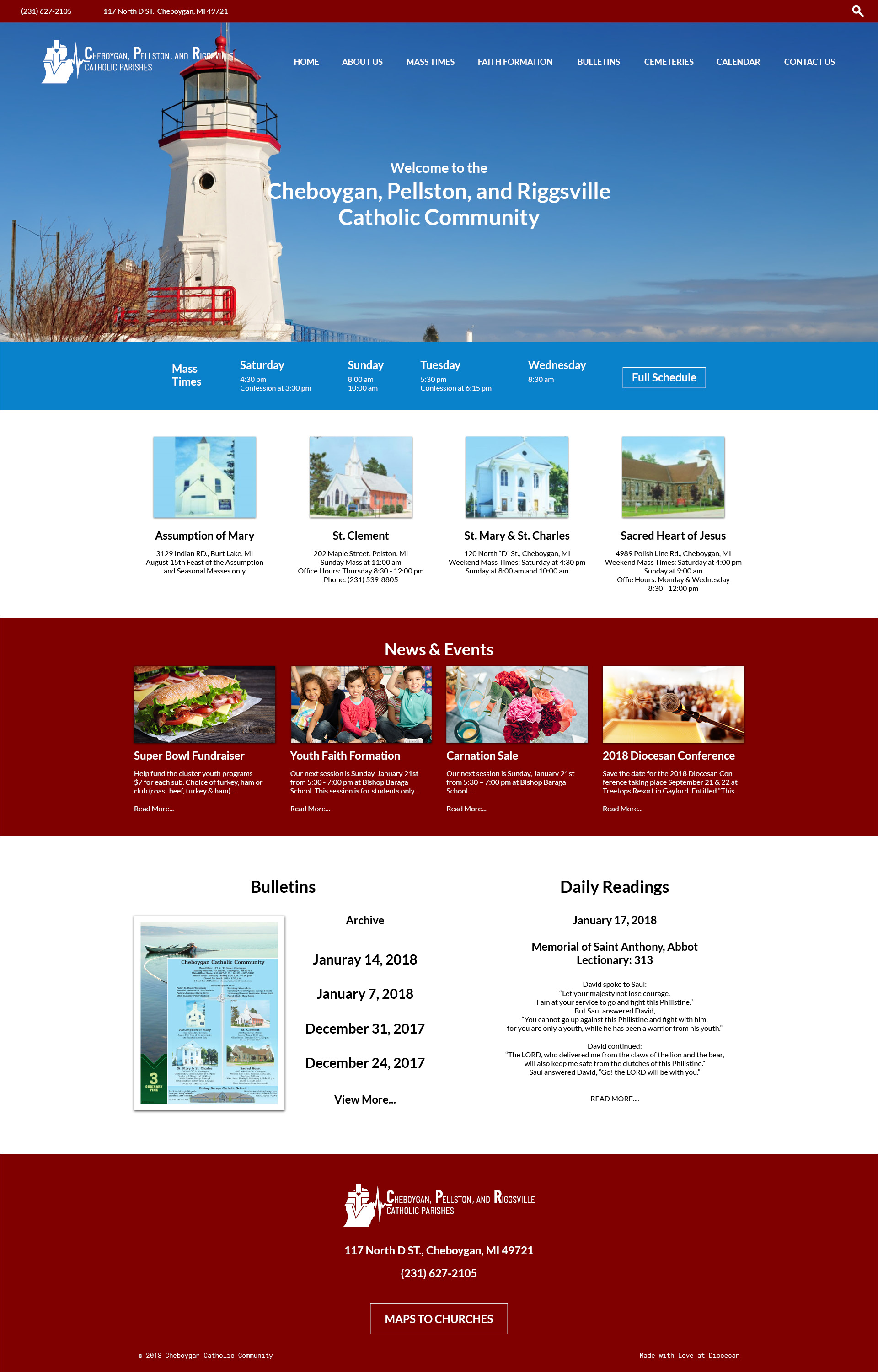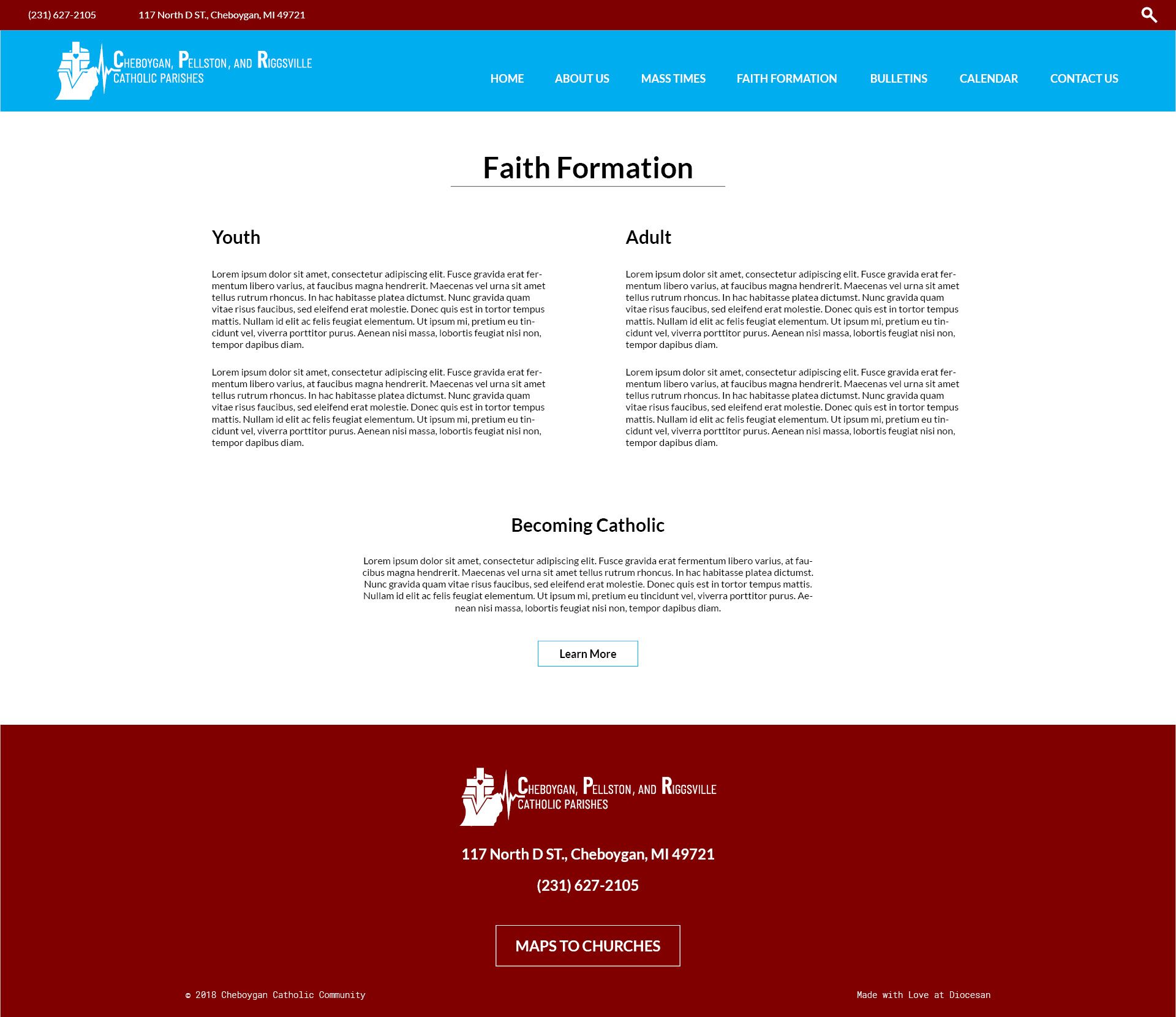 I wanted to get approval on the current pages I have for your website. I am starting to work on one more for you before moving to development but I have an example of the Homepage, Contact page, Mass times, and faith formation page. If you have any changes or ideas feel free to give me a call before hitting the button!