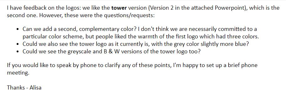 I have feedback on the logos: we like the tower version (Version 2 in the attached Powerpoint), which is the second one. However, these were the questions/requests: