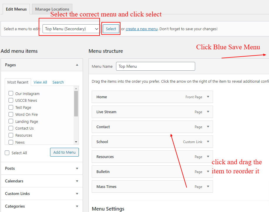 I have changed the Ave to Ave. for the school on the landing page and have added those items to the top menu (Screenshot below from Appearance > Menus in backend).