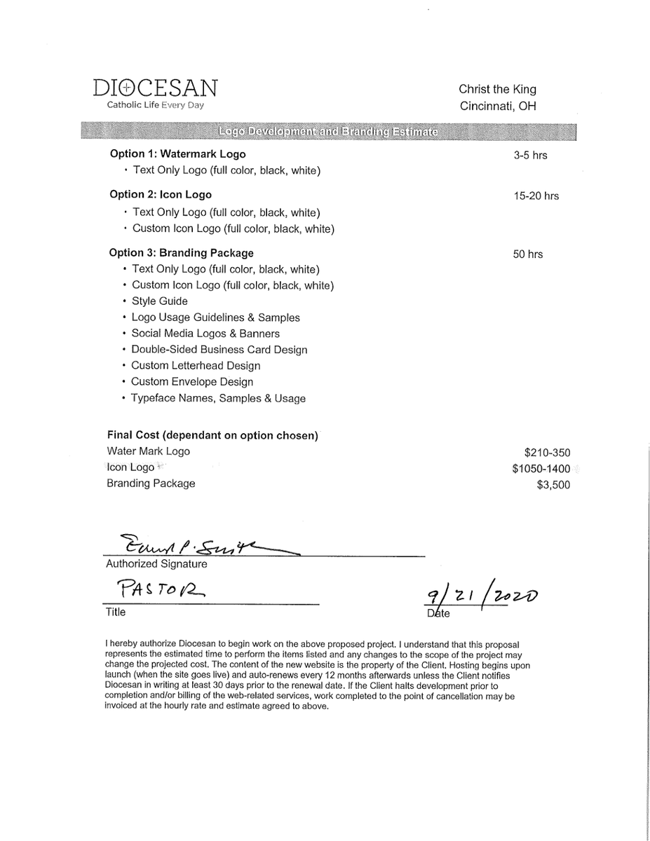 During our Deep Dive conversation, you liked the design for St James Cathedral in Orlando, FL (https://stjamesorlando.org/). We will also be updating the menu to a mega menu style. When we incorporate your content, colors, and new logo, you will have a website that is unique and showcases Christ the King. I have also included information about hosting the website as well as the cost to host your domain name. If you are wanting to purchase a new domain name, Diocesan can make that purchase for you ($15 per domain name) or you can transfer it to us for hosting and renewal.