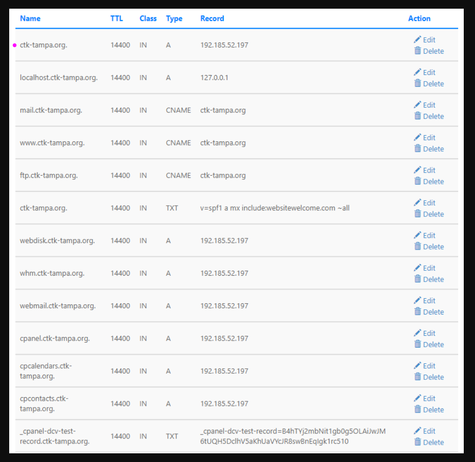 Looks like the domain update still isn't propagating, so now we're going to update the rest of the A Records. It should be a simple fix. Edit every A Record with the IP adress of '192.185.52.197' to now point to '104.156.48.29'. Additionally, don't forget to change the TTL to 900, so that the domain propagates faster.