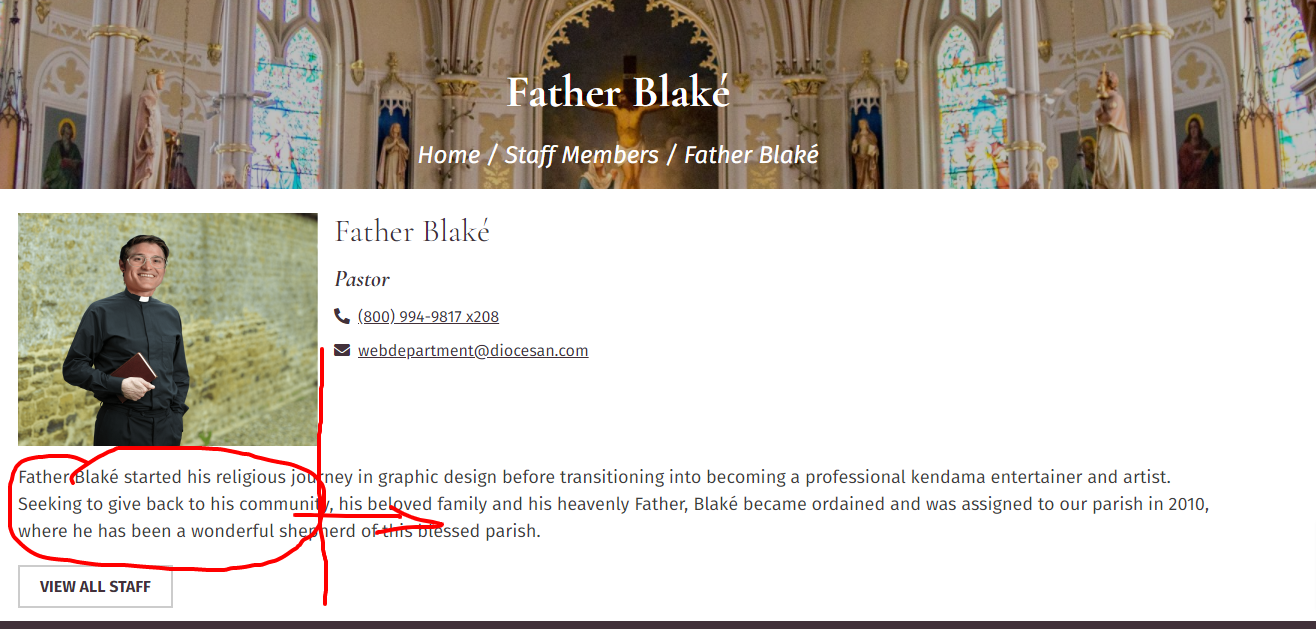 ✔ Single Staff - Text should be all on one side of the page. No wrapping below the featured image. If there is no ftd image then the content goes full width.