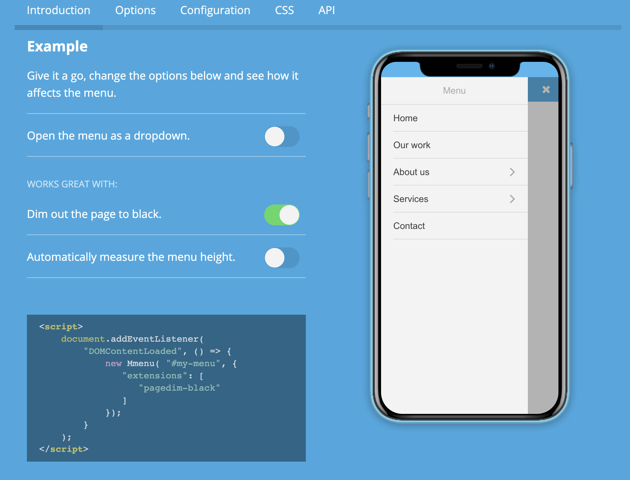 , Mmenu is handled with just the plugin on this Template (so, it doesn't use the JS described in the attached article).