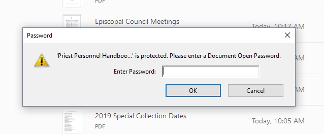 I have set the password for the Priest and the Deacon Policy Handbooks pages, but for this PDF document, it is not letting me download the PDF unless I have a password.