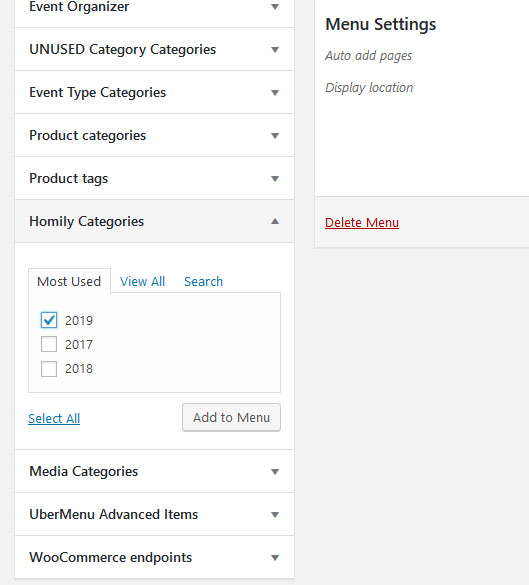 I tried adding the homilies page to the mega menu, but I didn't see a way of adding the Homilies category to the menu, so I created a custom link and named it Bishop's Homilies 2019. Is this correct way???