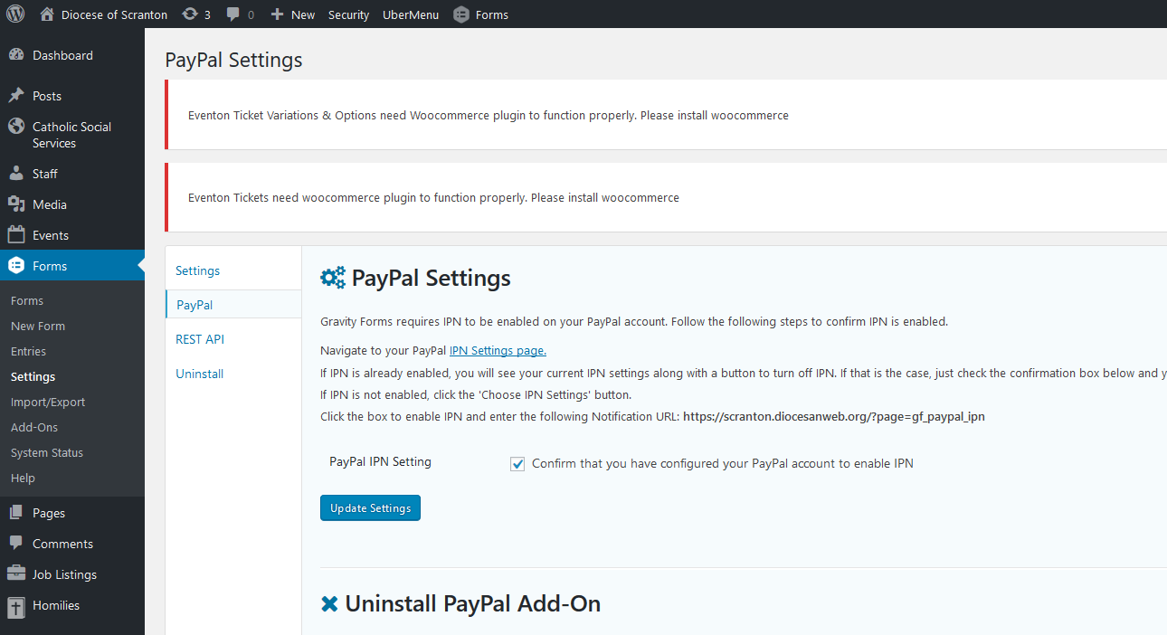 We are trying to add some of the registration forms we are currently using on www.dioceseofscranton.org. We need to be able to use PayPal for those that involve payment. Can you please install the plugin we need for this? We believe it's the Gravity Forms PayPal Standard Add On . That's what we are using now.