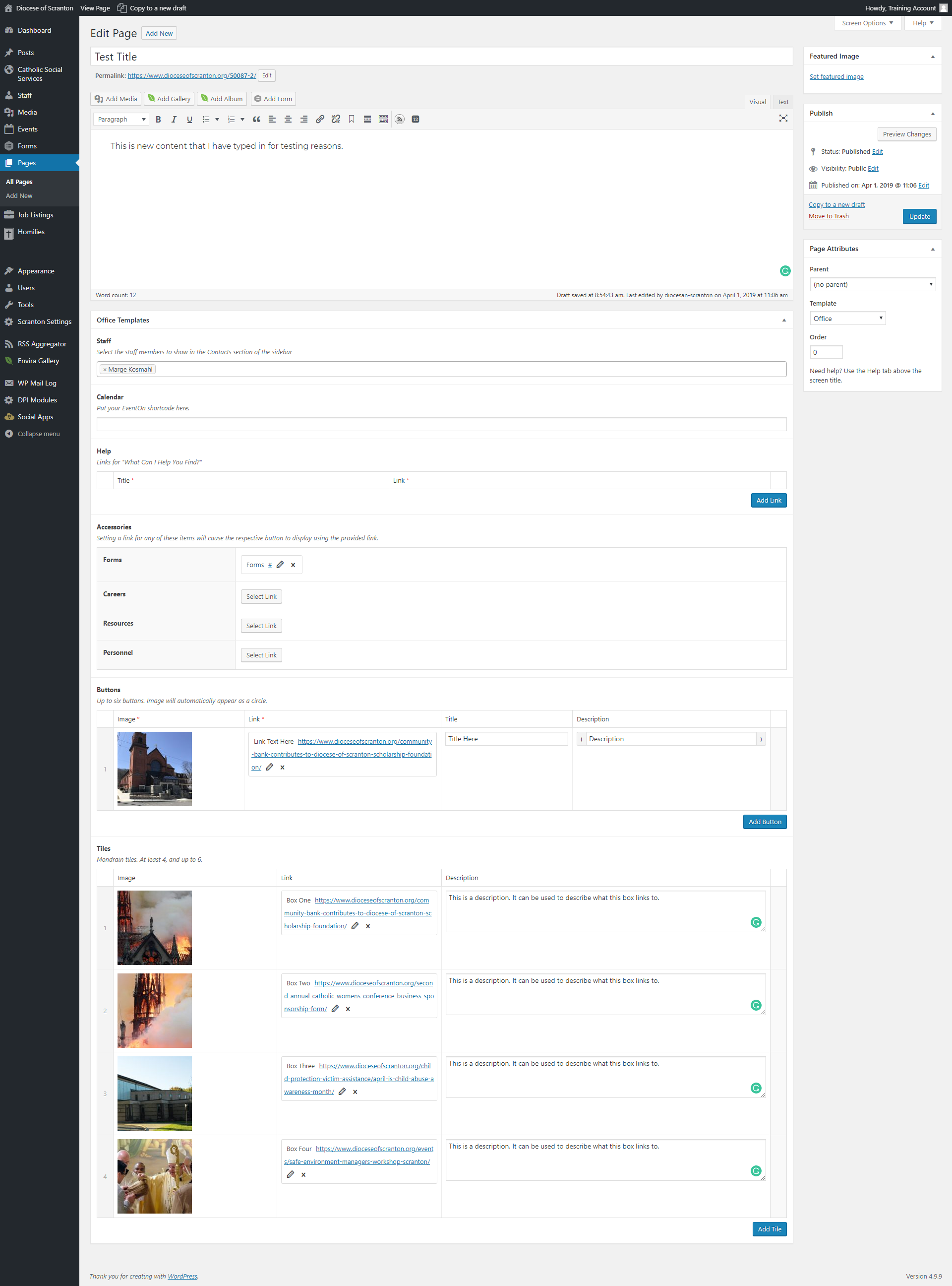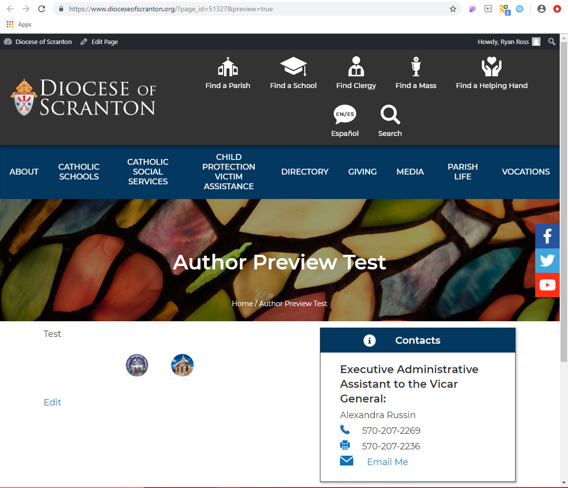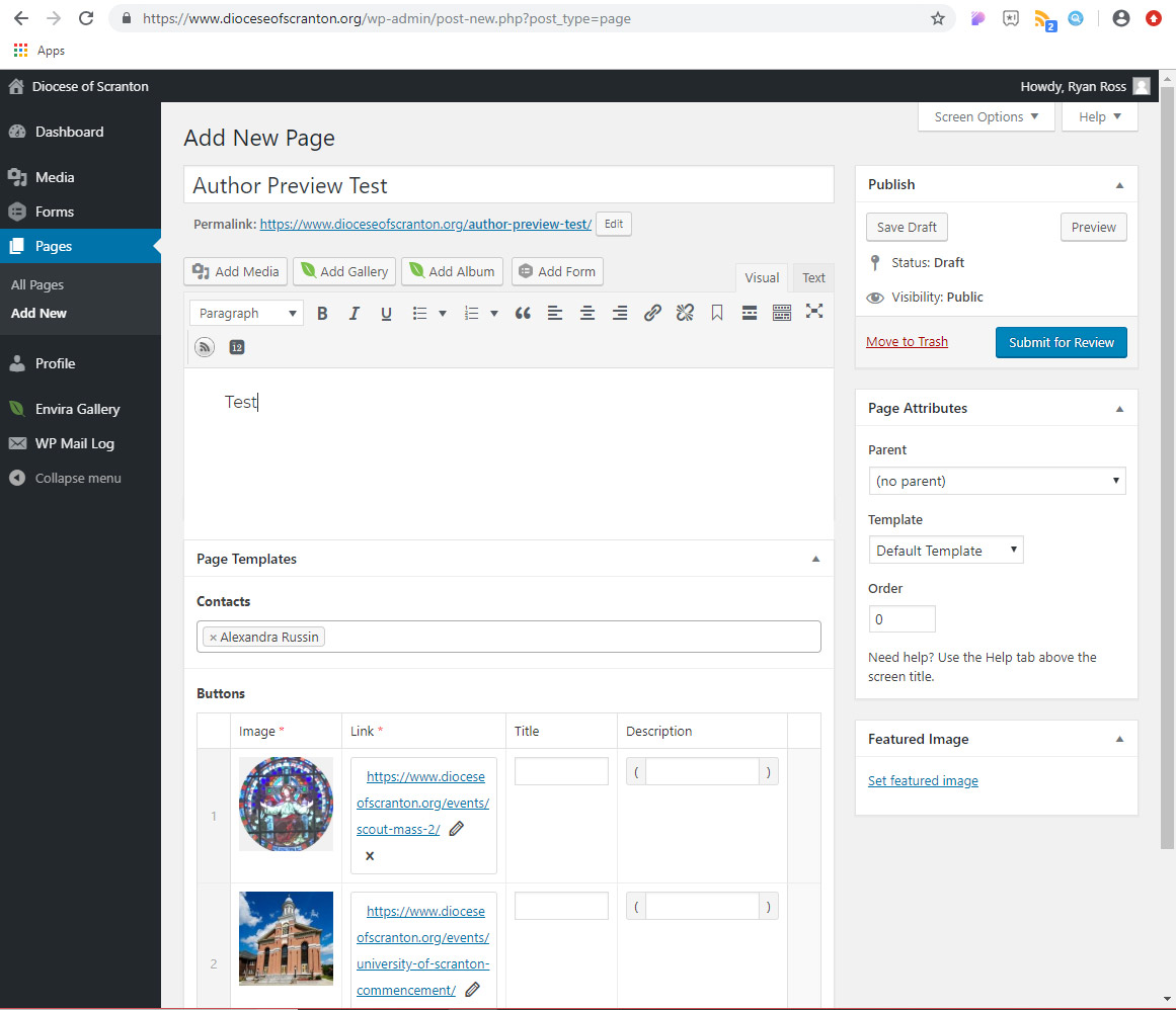 For example, this page was previously blank (no title or content at all) and I added some different areas. If I want to see what it looks like before submitting for review (can't publish) then this the second image is what I see in the preview. https://www.dioceseofscranton.org/50087-2/