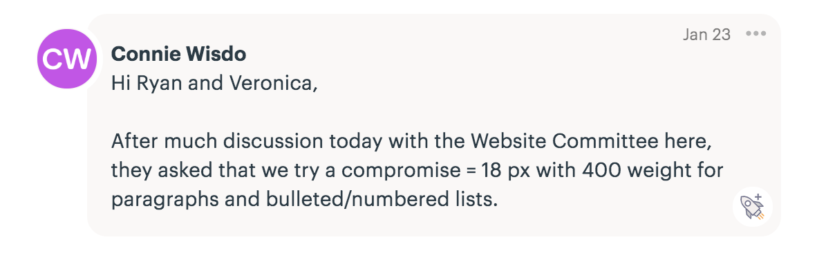 From the list: Build ✔ Update paragraph font & bulleted/numbered lists Veronica A. added this on Jan 29, 2019 Completed Jan 29, 2019 by Ryan R. Assigned to Ryan R. Notes Screen Shot 2019-01-29 at 3.06.38 PM.png 72.4 KB • Download Comments & Events Ryan Ross completed this to-do. Jan 29, 2019 at 8:18 PM