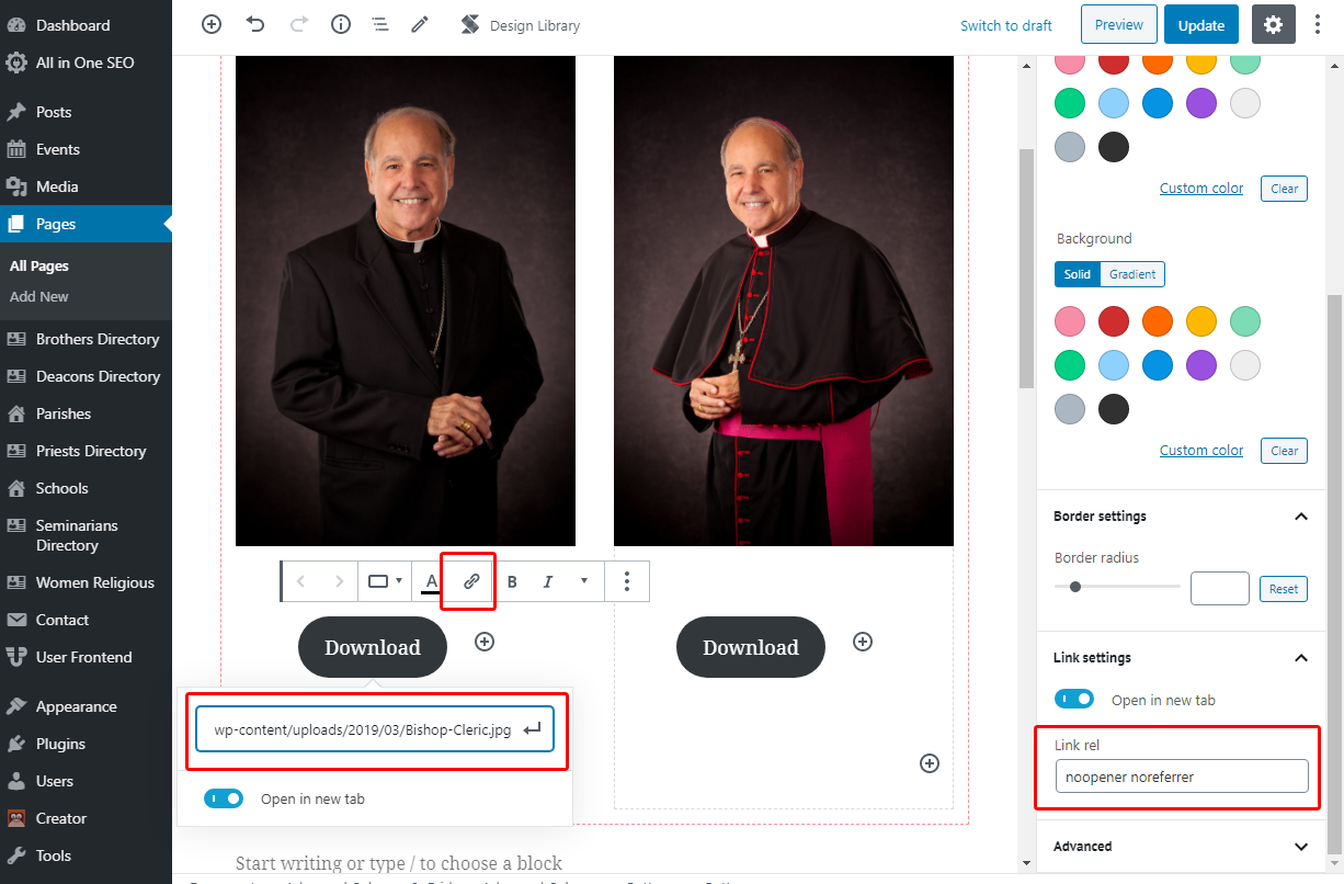 With all of that said, you'll simply want to use the chain-link icon option on the button to apply a link to it. You can use the rel attribute in the side panel for things like "nofollow", "noopener", and "noreferrer". I tested and confirmed this resolves the issue you were experiencing with Gutenberg Blocks with Links on the Official Photos (https://www.dosafl.com/bishop-felipe-j-estevez/official-photos/) page.