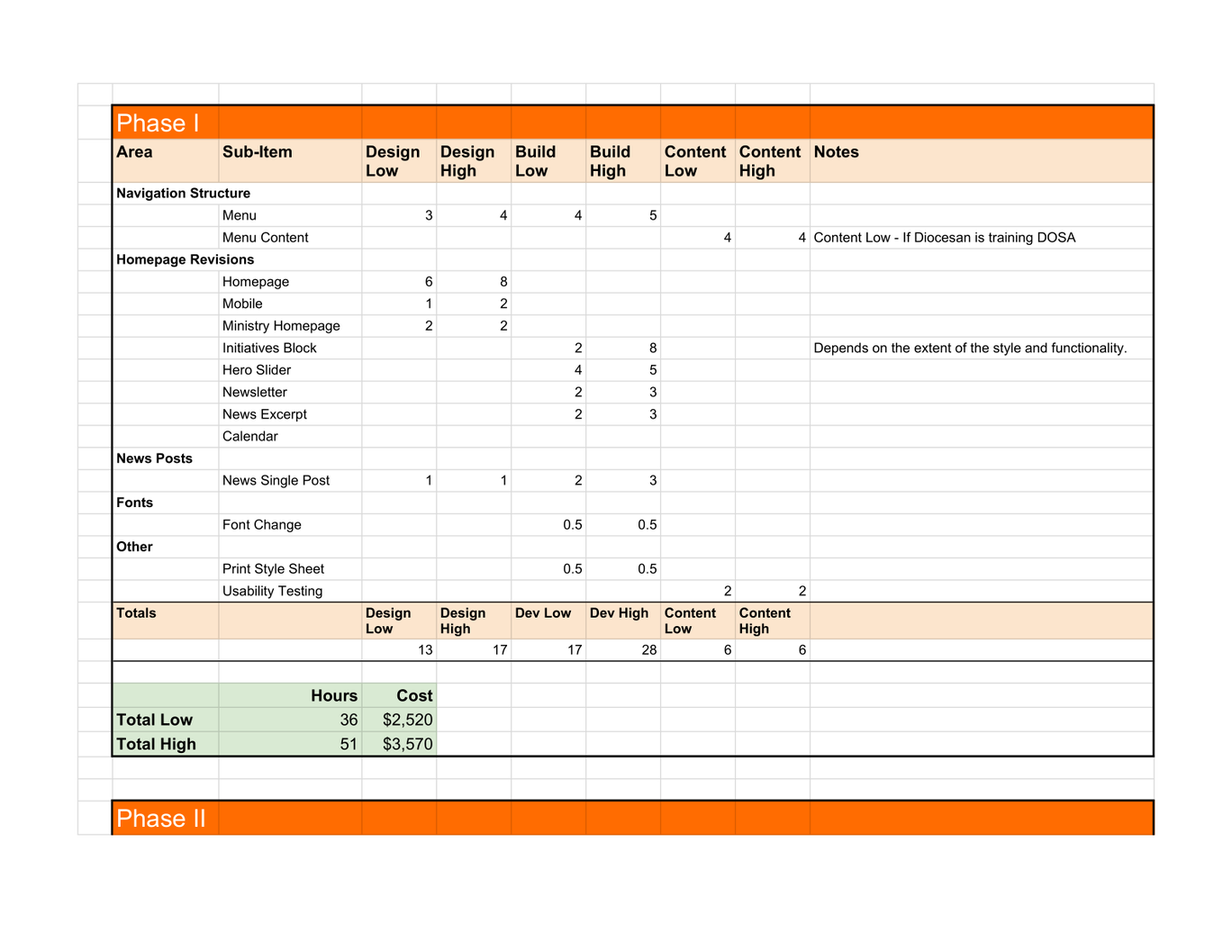 The second part of the spreadsheet is the information related to the proposal. We included a breakdown of our initial proposal and then we included a Phase 1 and Phase 2. Since we would be making some changes we wanted to let you know what would still be remaining and the cost. If and when you would be ready, we could proceed with Phase 2.