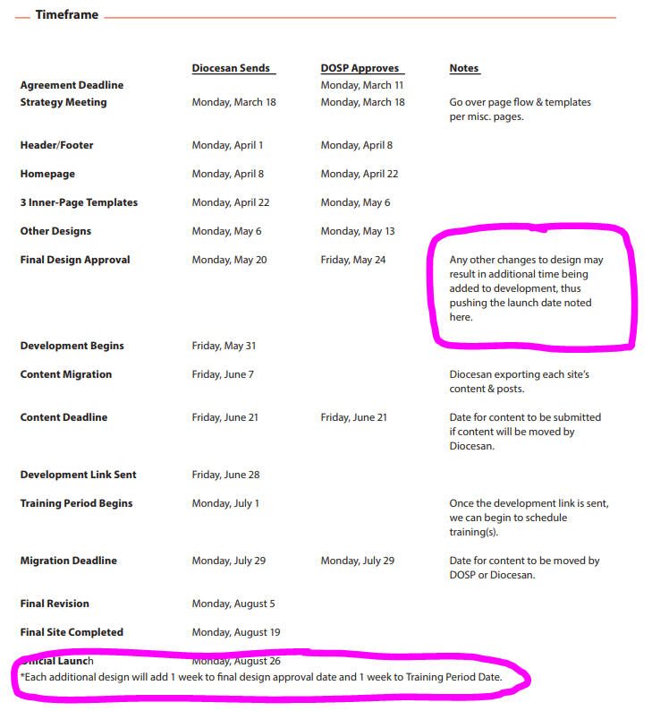 Rather than adding the a total of 18 weeks of design/development for each literal mockup (9 additional designs between DOSP Click, Find a Parish, Find Clergy, Find a School, and Staff), we added 3 weeks to design (1 week per module) and 3 weeks to development (1 week per module). This changed the original timeline from August 26 to 6 weeks later, October 7.
