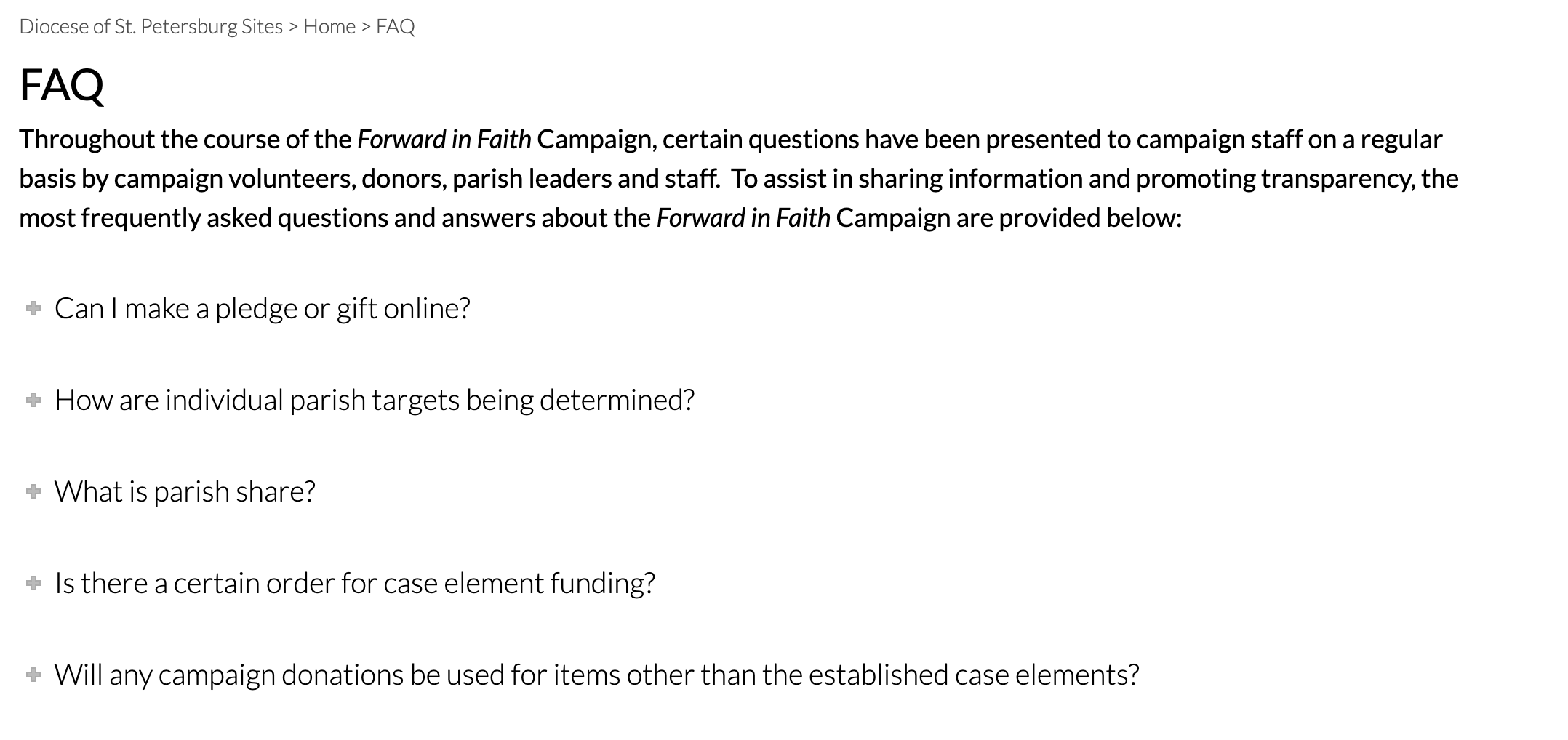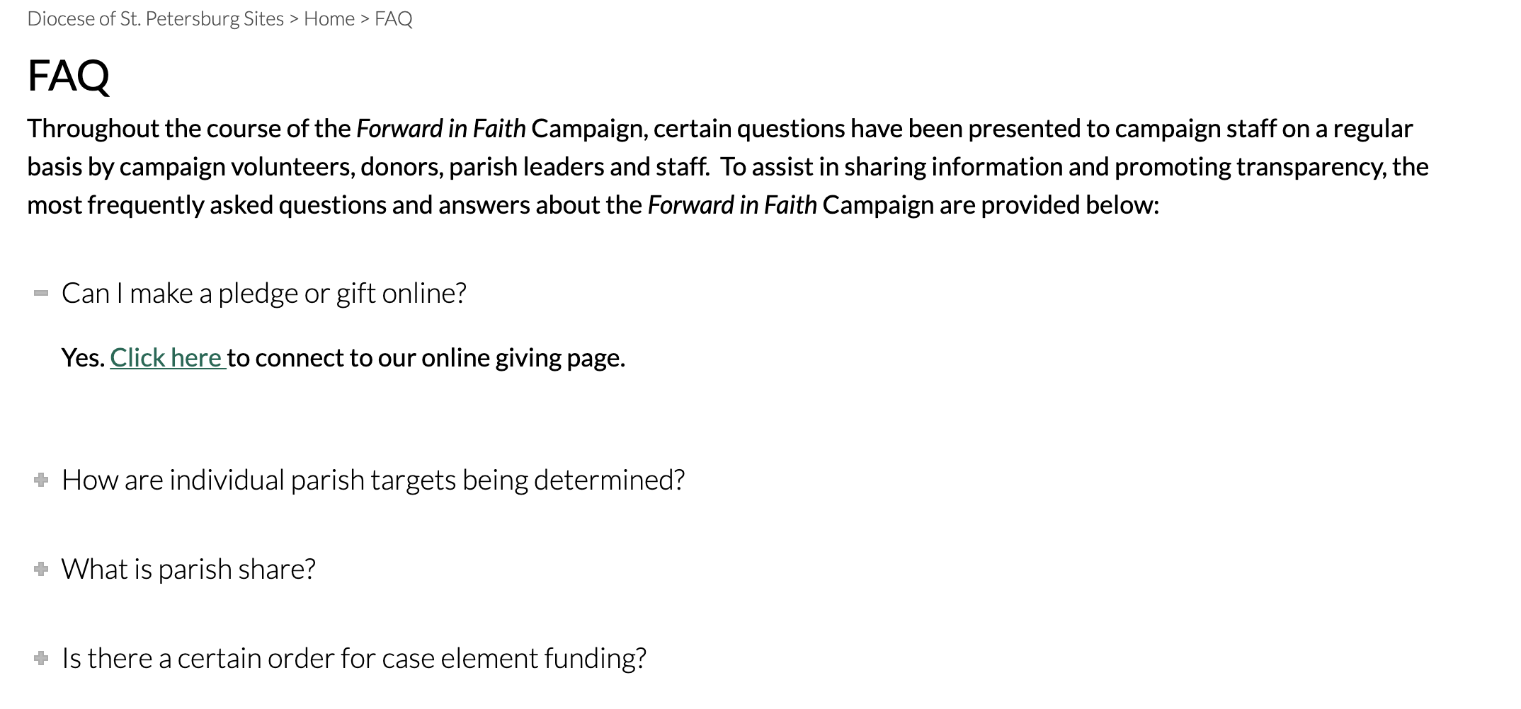 From the list: Phase II ❏ Adding Accordion block Veronica A. added this on Oct 01, 2019 Assigned to Ryan R. Notes accordion title = bold paragraphtext inside accordion = paragraphhttps://www.dosp.org/forwardinfaith/faq/ Screen Shot 2019-10-01 at 4.20.54 PM.png 184 KB • Download Screen Shot 2019-10-01 at 4.21.00 PM.png 181 KB • Download