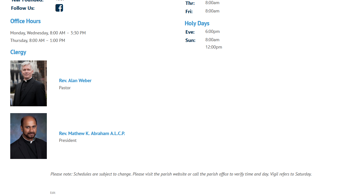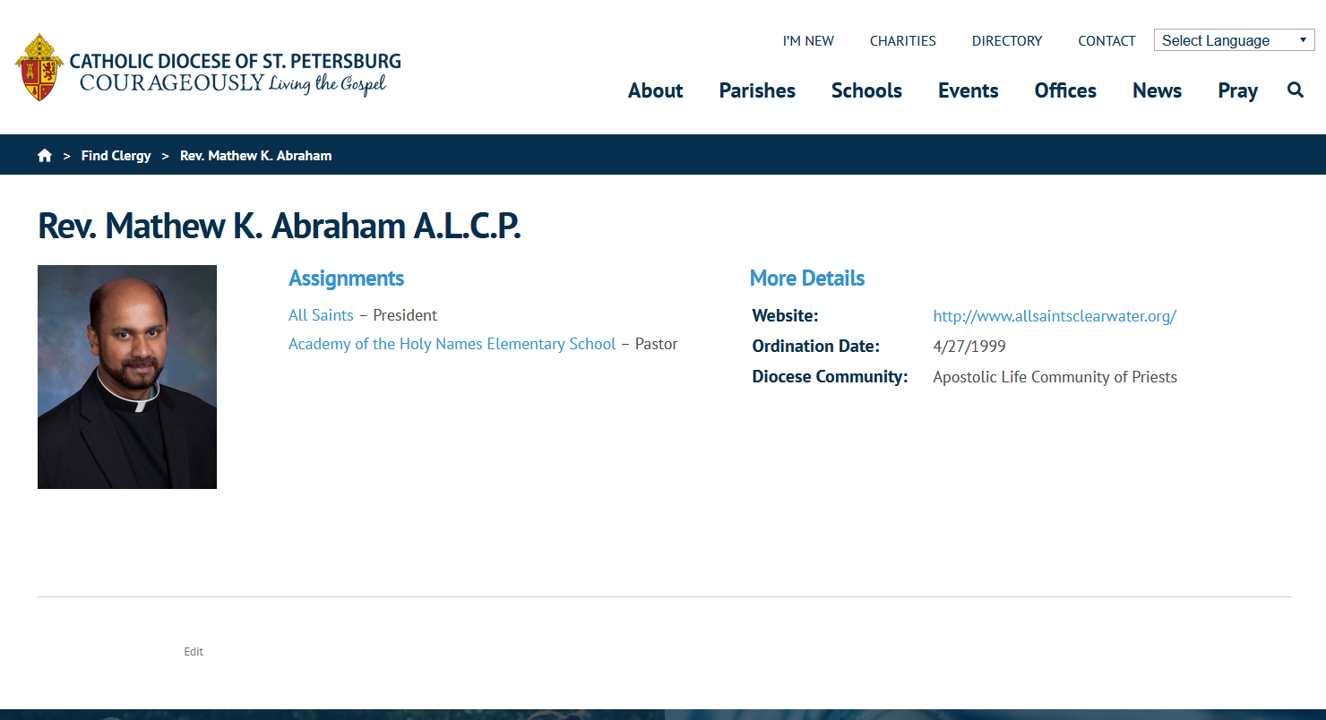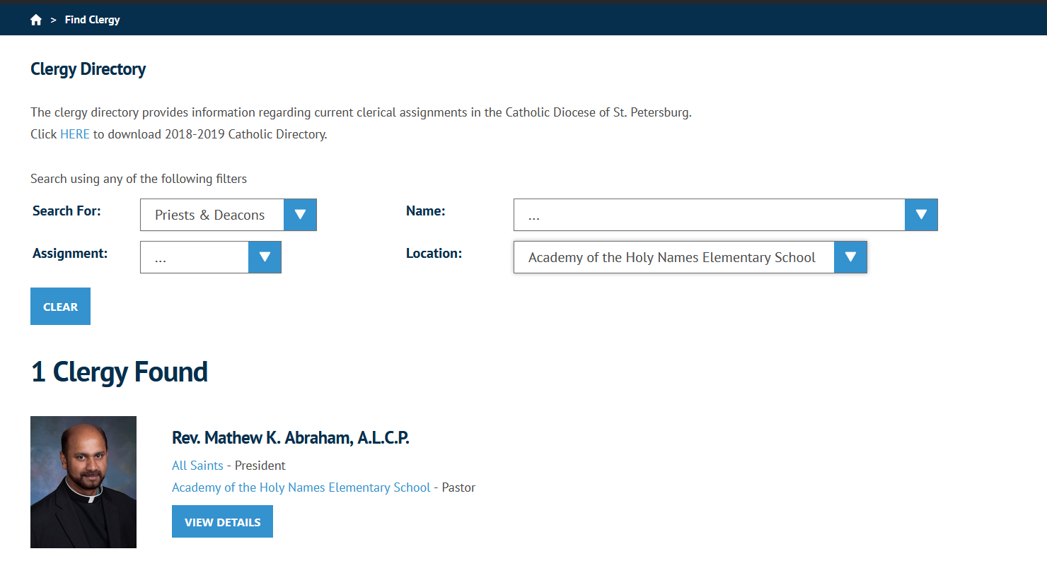 I used Fr. Mathew Abraham as a test clergy member. He doesn't have any assignments, but I added him to a church and school respectively to demonstrate.