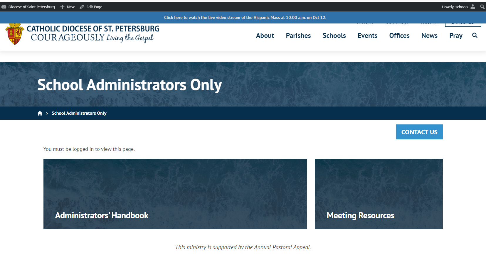 We have also discovered that the Schools User cannot see the live view of the School Administrators Only homepage even though they are logged in and their user is the author of the page. See attached screenshot #1. And if they try to see the live view of any of the School Administrators Only child pages, they cannot see those either. See attached screenshot #2.