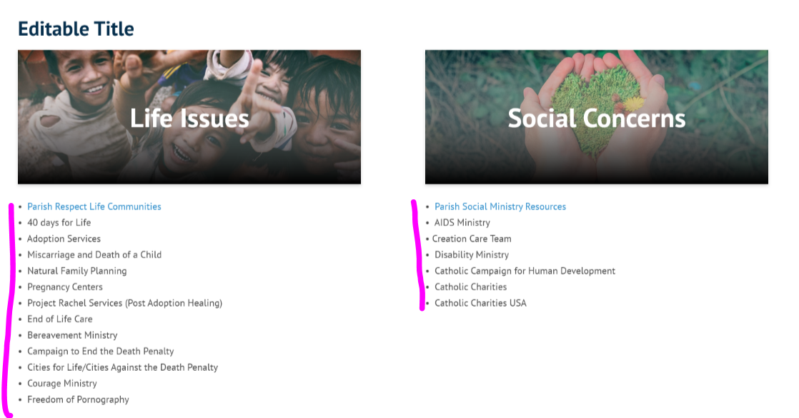 - List of child pages for each of the sections under a ministry