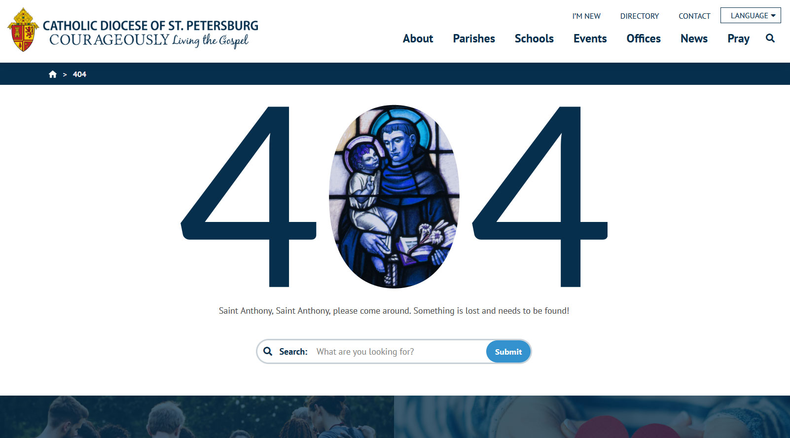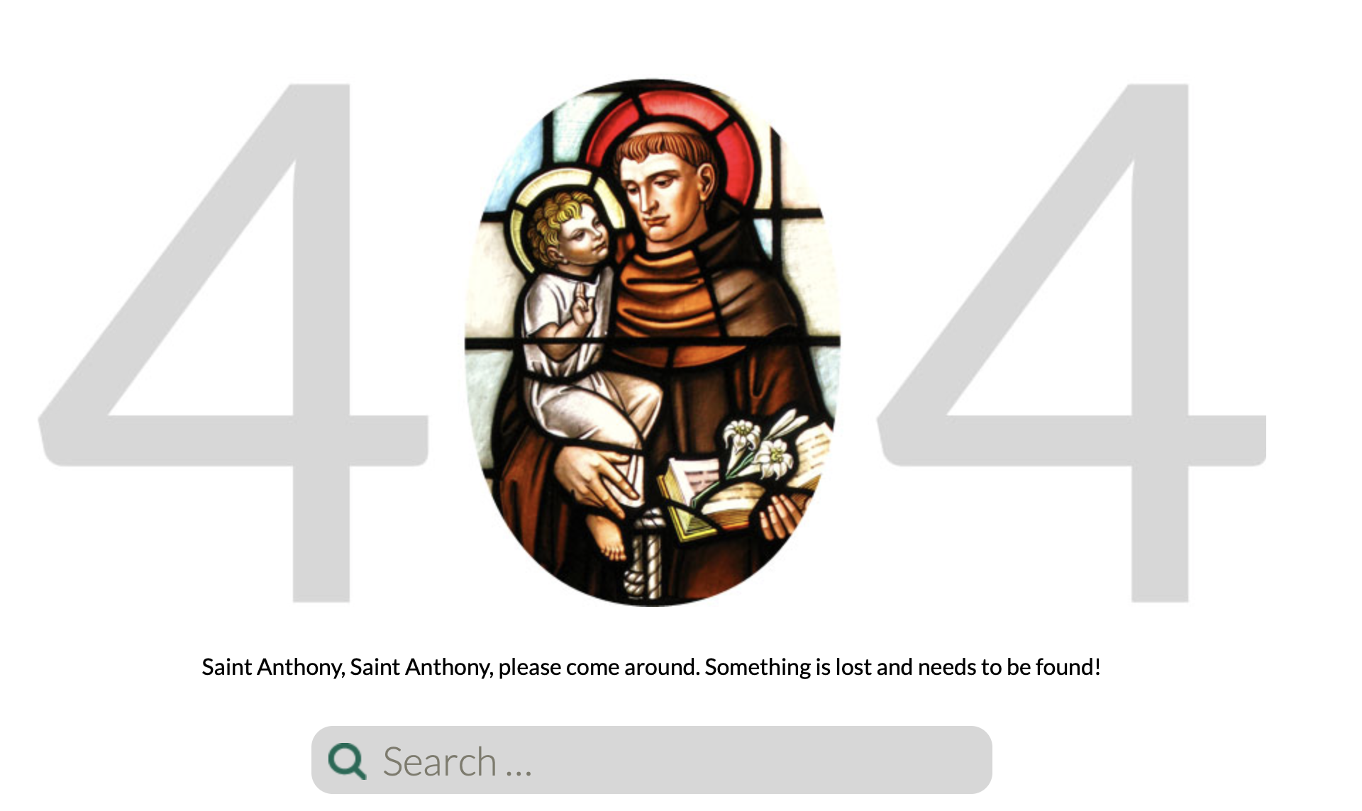 Also – is there a way to incorporate our previous 404 message – with the St. Anthony image and text (see 2nd attached screenshot)? Perhaps if the image of St. Anthony was all in blue or something. This last part (about the St. Anthony image) is not critical and could wait until a “Phase 2” but I wanted to at least ask.