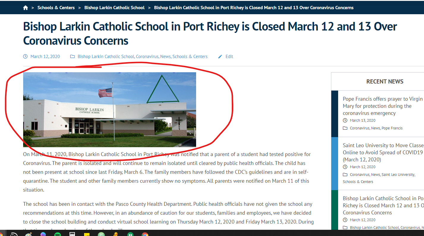 DOSP's Featured Image Post : https://www.dosp.org/bishop-larkin-catholic-school-in-port-richey-is-closed-march-12-and-13-over-coronavirus-concerns/