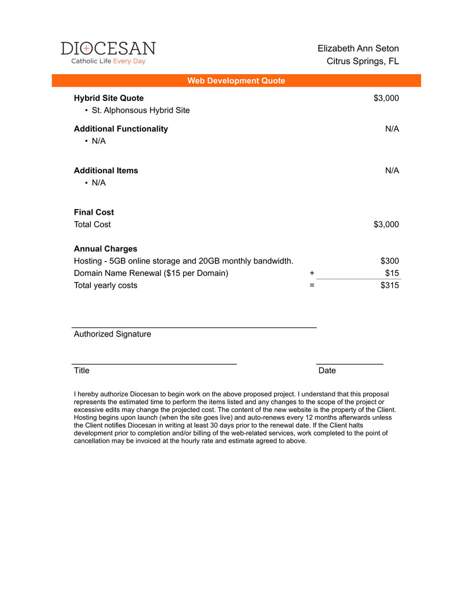 We appreciate you taking the time to speak with us a week or so ago. During the Deep Dive conversation, it was determined that the St Alphonsus Hybrid will be the foundation for your new website. After we apply your branding, fonts and colors, and content you will have a unique website that showcases Elizabeth Ann Seton.