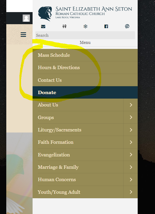 “Mass Schedule, Hours & Directions, Contact Us, and Donate” menu items from being displayed when you click on a menu item with a caret, he wants to know if you can change the color of these menu items to BLUE text with the same white background as the top instead. He wants these 4 menu items to have the same effects as the icon when you click on them.