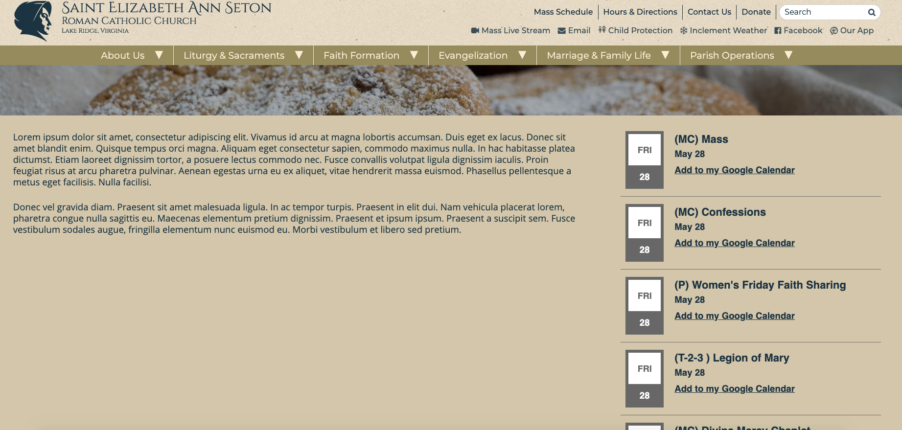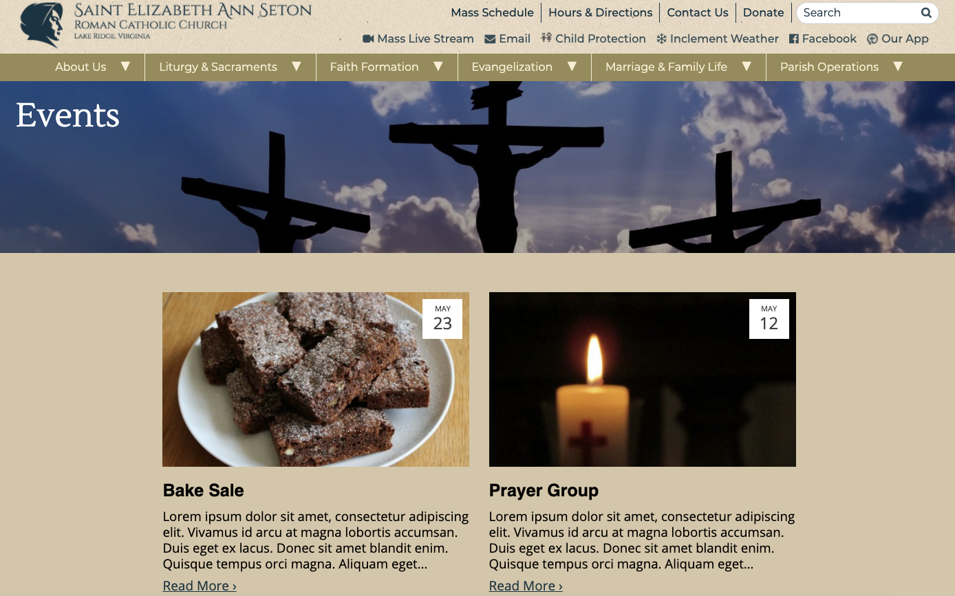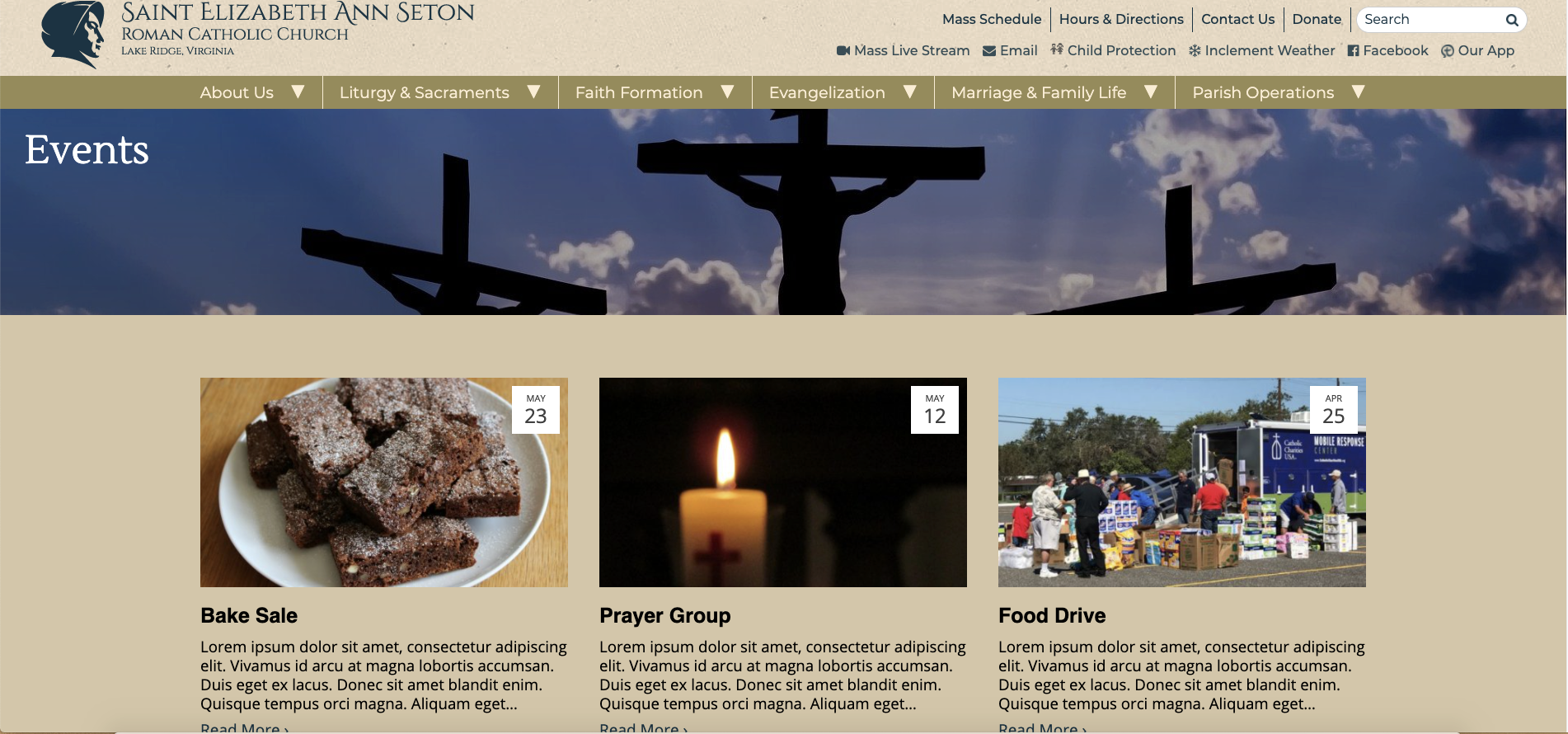 - Event Archive page: I know Father wanted a 2.5% margin, however, due to the size of the posts, the images, and the text variance will occur in the different screen sizes. A 2.5% margin is not really possible with those dimensions. On desktop, you will see three events displayed across, on a laptop, there will be two across. Is this acceptable? Here are screenshots: