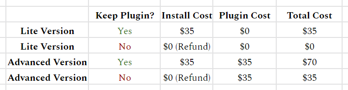 Secondly, I was hoping to speak with you about the restyling of the posts and the reordering of the posts as well. I called earlier and spoke with Mary specifically about the posts. Donna and I are very surprised about the ‘additional cost’ for the plug-in. Per your previous email ‘the plug-in is a flat rate of $35, which includes install, setup, testing, training” and per our phone conversations that we’ve had, there was no mention that we had to pay for the ‘cost’ of the plug-in as well. Thus, our understanding is that the flat-rate applied to a plug-in regardless if it be a ‘lite or advanced’.