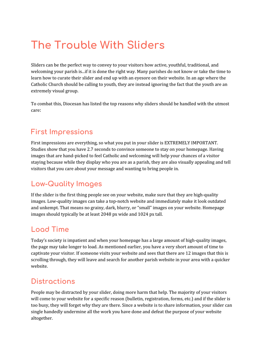 2. For the scrolling pics on the home page, how many can we have? Can we increase or decrease the amount of photos? Can we choose the duration of each photo as it scrolls? We would like the option to link a scrolling photo to a URL or page (please reference Diocese of Orlando). And we would like the “Dots” instead of the arrow keys. We also requested the option to add a video in lieu of pictures as well.