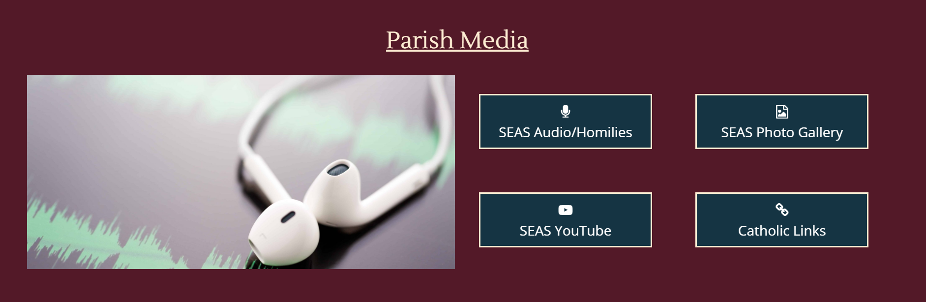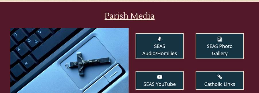 Here is the sketch of the layout for the burgundy section. Father would like to decrease the height of the burgundy box. That is, he would like the height to come down to where the line is under ‘Parish Media’. But please DO NOT CHANGE the photo size. If you have any other questions, please call me.