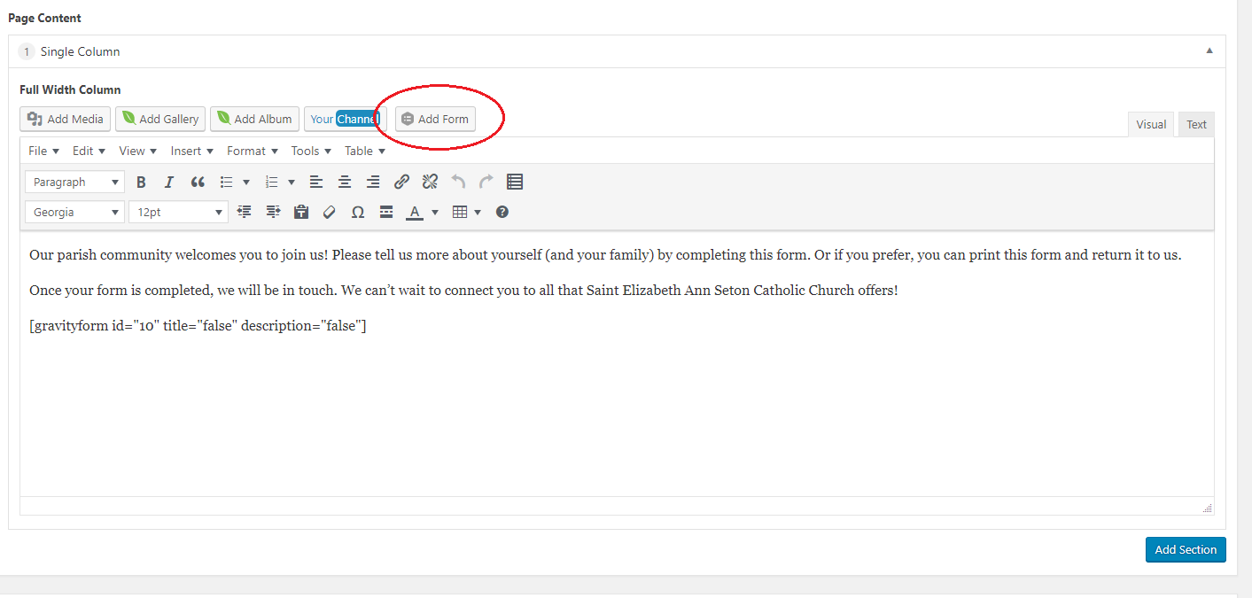 The registration form is complete and can be added to whatever page you'd like. Above the editing area on each page is an "add form" button - you just click the button and add whichever form you'd like to add and the shortcode will be added at the location of your cursor on the page.