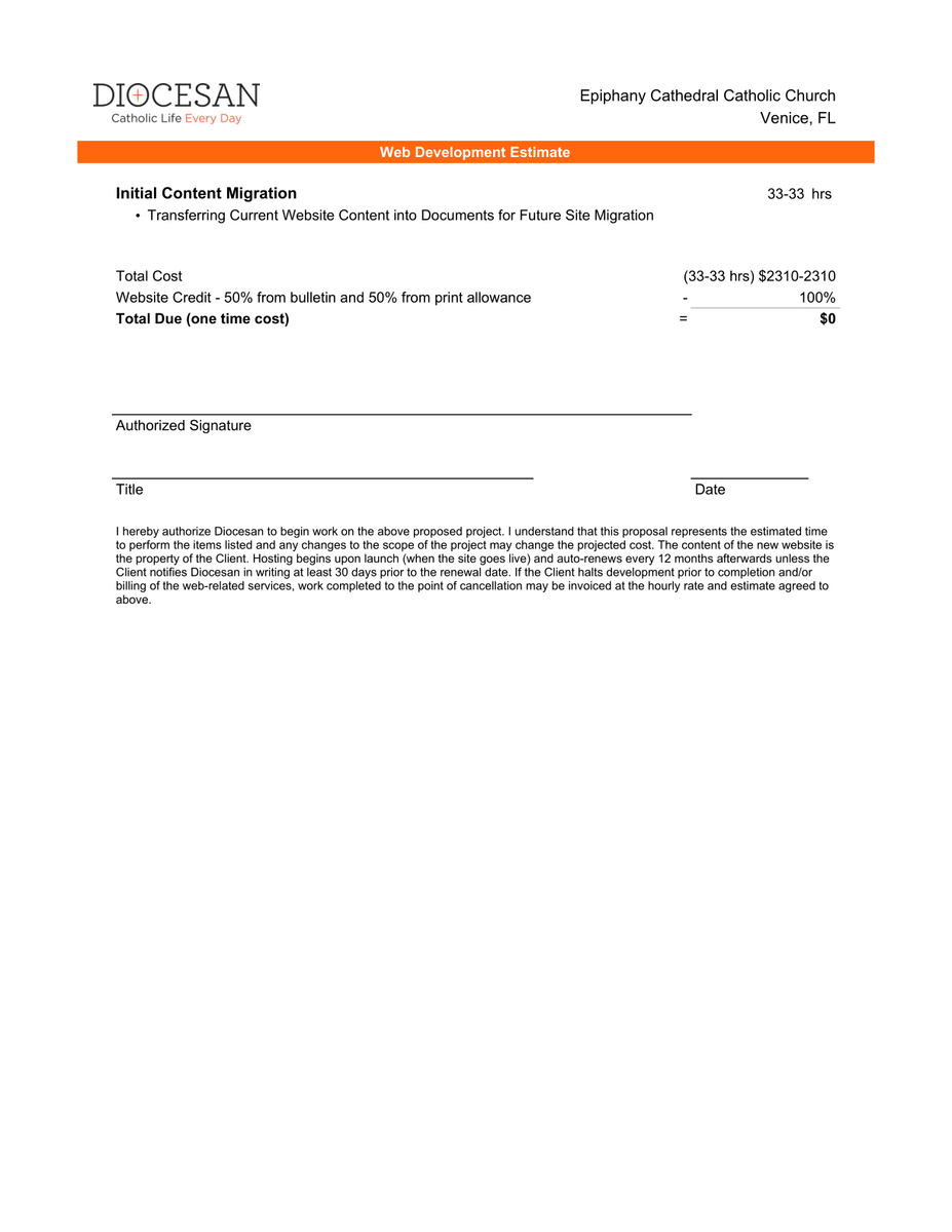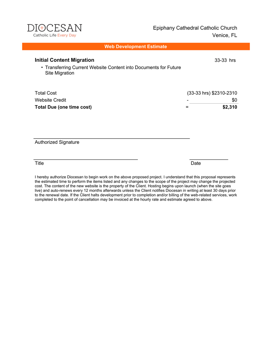 I am sending along the initial content migration quote for you to review. Please know that the cost can go down if you are helping with some of the migration - the number on the quote is the max cost (if we are migrating all of the content).