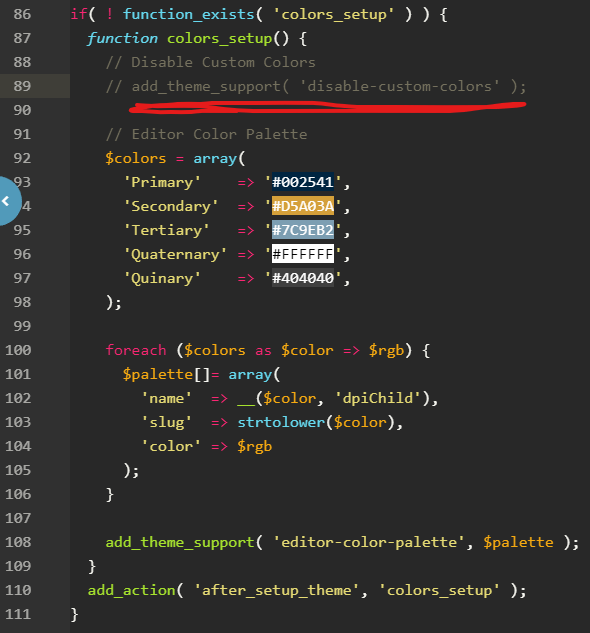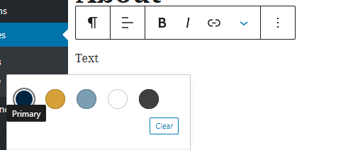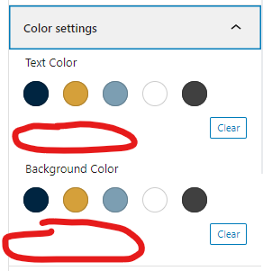 ✔ Theme - Need access to change to custom colors in the block pallette and block settings