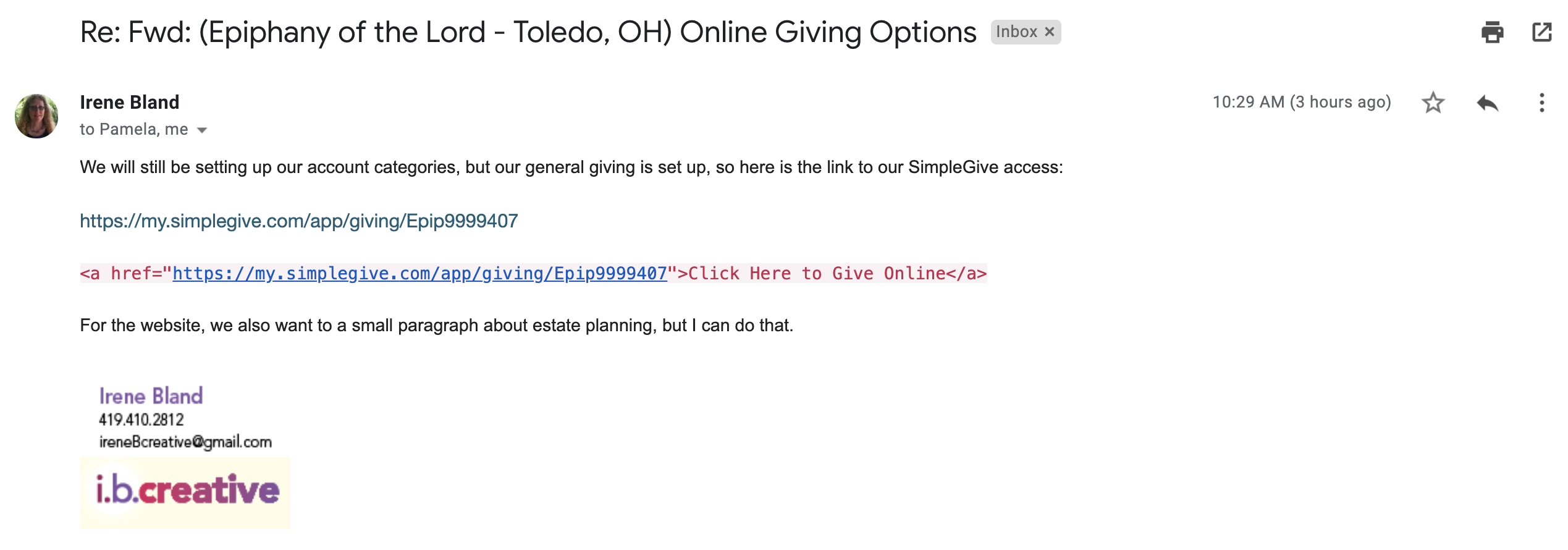 ✔ Online Giving Link (set up page & button according to Irene's sitemap)