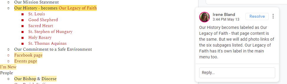 From the list: Normal ✔ "Our History" should be retitled "Our Legacy of Faith" but the content will be the same Veronica A. added this on May 17, 2019 Completed May 29, 2019 by Cody A. Notes https://docs.google.com/a/diocesan.com/document/d/1MQNaRSftPuIogMgEs3V1DxdQiUUfj8S8x-CrFTV7Seo/edit?disco=AAAADAOHXTg image.png 60.2 KB • Download Comments & Events Cody Armock completed this to-do. May 29, 2019 at 5:21 PM